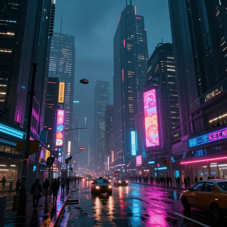Maximg in a futuristic cyberpunk cityscape, neon lights reflecting on wet streets, detailed skyscrapers towering above, vibrant colors and intricate reflections, moody atmosphere with flying vehicles and bustling crowds, digital art style.