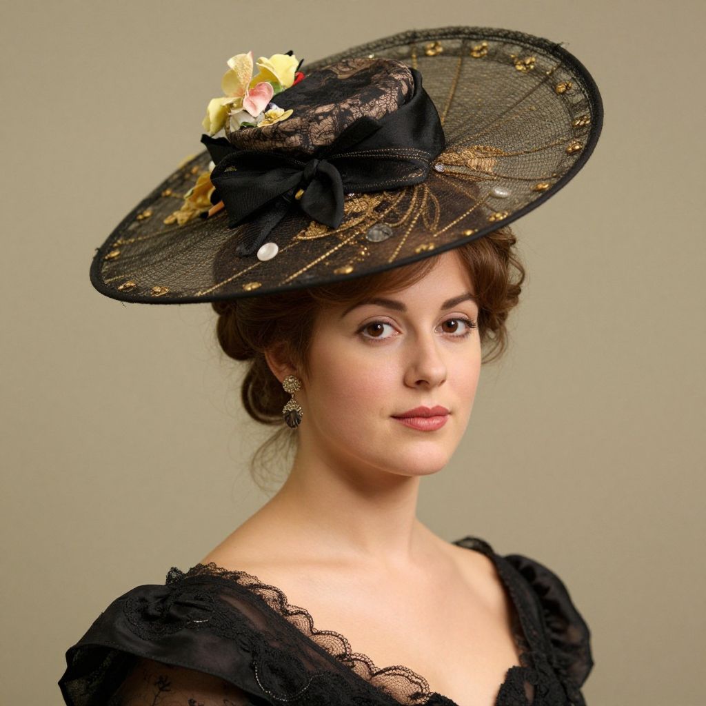 A beautifully styled woman in a vintage outfit, adorned with a large, ornate hat and a floral accessory, exudes elegance reminiscent of Auguste Charles Mengin and Henri de Toulouse-Lautrec's artistic styles.