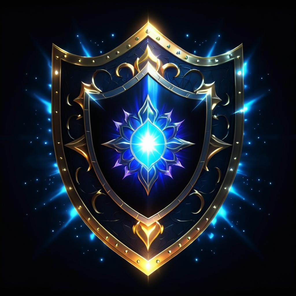 A highly detailed enchanted shield featuring a golden star emblem at its center emitting a bright blue glow. The shield has a dark blue surface with intricate golden borders and rivets. The background is dark with subtle glowing blue and purple effects, enhancing the magical and powerful aura of the shield.