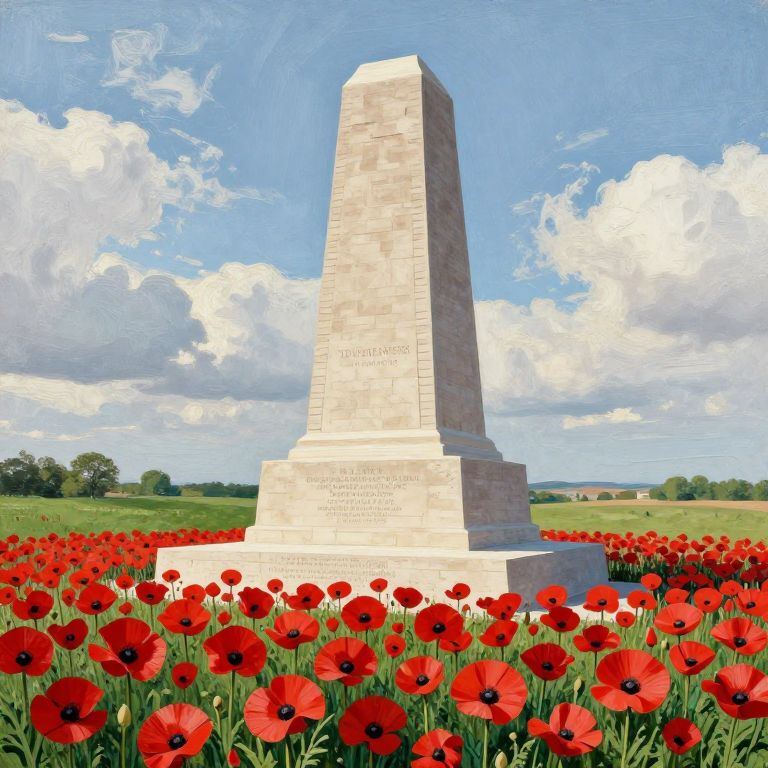 Staining artwork, The Thiepval Memorial, a column of red poppies on surrounds it in Flanders Field, british WW1,