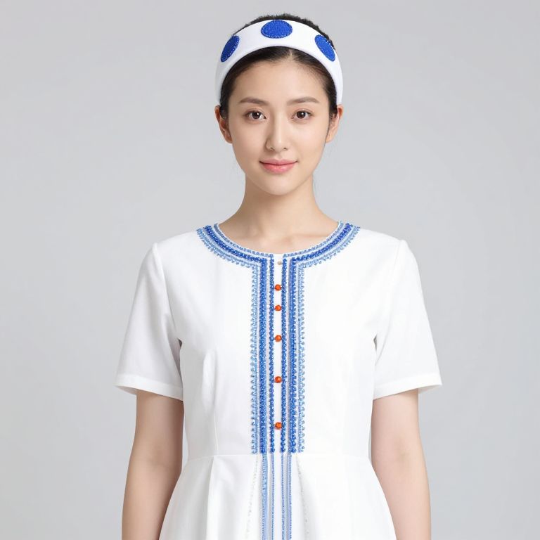Female wearing a white dress with blue and orange beads on the front and a white headband with blue circles on the top.