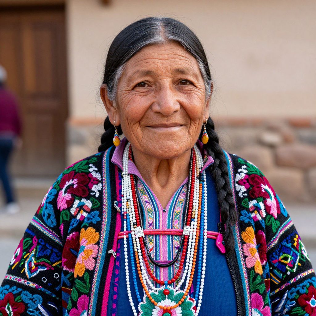 Elderly Andean woman radiantly smiles while wearing vibrant traditional attire adorned with intricate floral patterns and layered beaded necklaces, exuding cultural heritage and warmth.