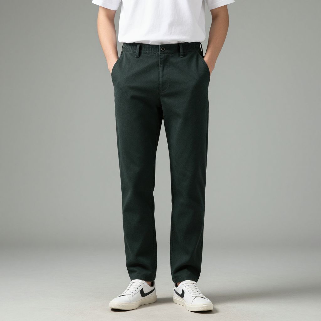Photograph of a mannequin wearing a yellow sweater, brown pants, black belt, and white sneakers, standing against a plain gray wall.