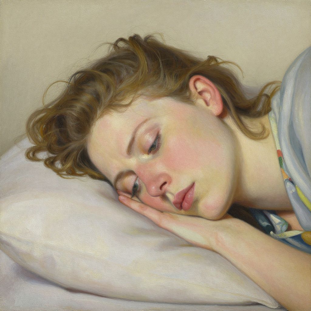 Photorealistic painting of a young, fair-skinned woman with curly brown hair, eyes closed, resting her head on a white pillow, looking serene