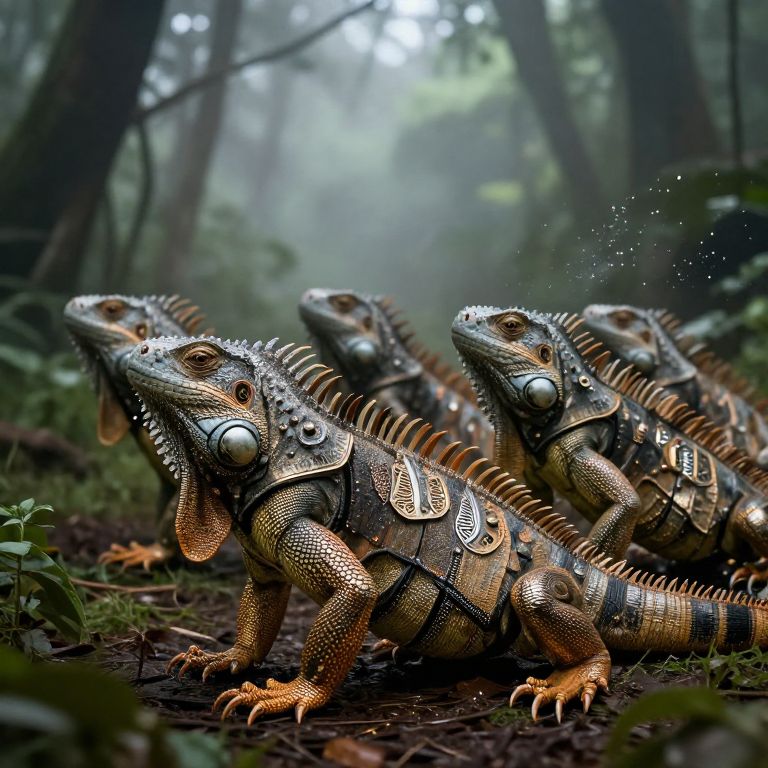 Clockwork iguanas with intricate metallic scales march in formation through a misty forest, their synchronized movements creating a mesmerizing display as they slice through the air, leaving trails of shimmering particles in their wake.