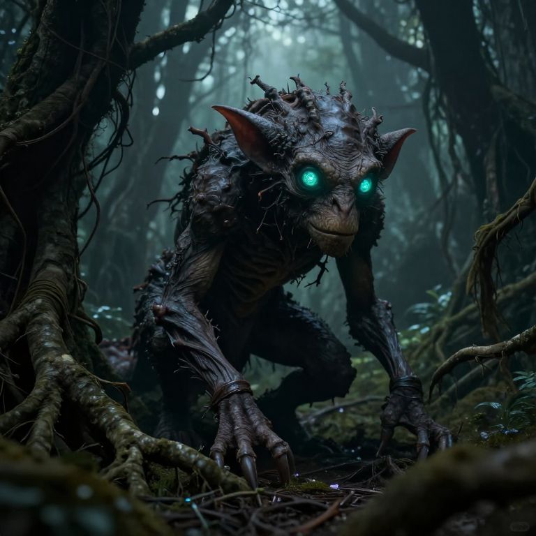 Digital art: Dark, eerie forest creature with glowing blue eyes, textured, twisted, bark-like skin, and large, pointed ears, crouching