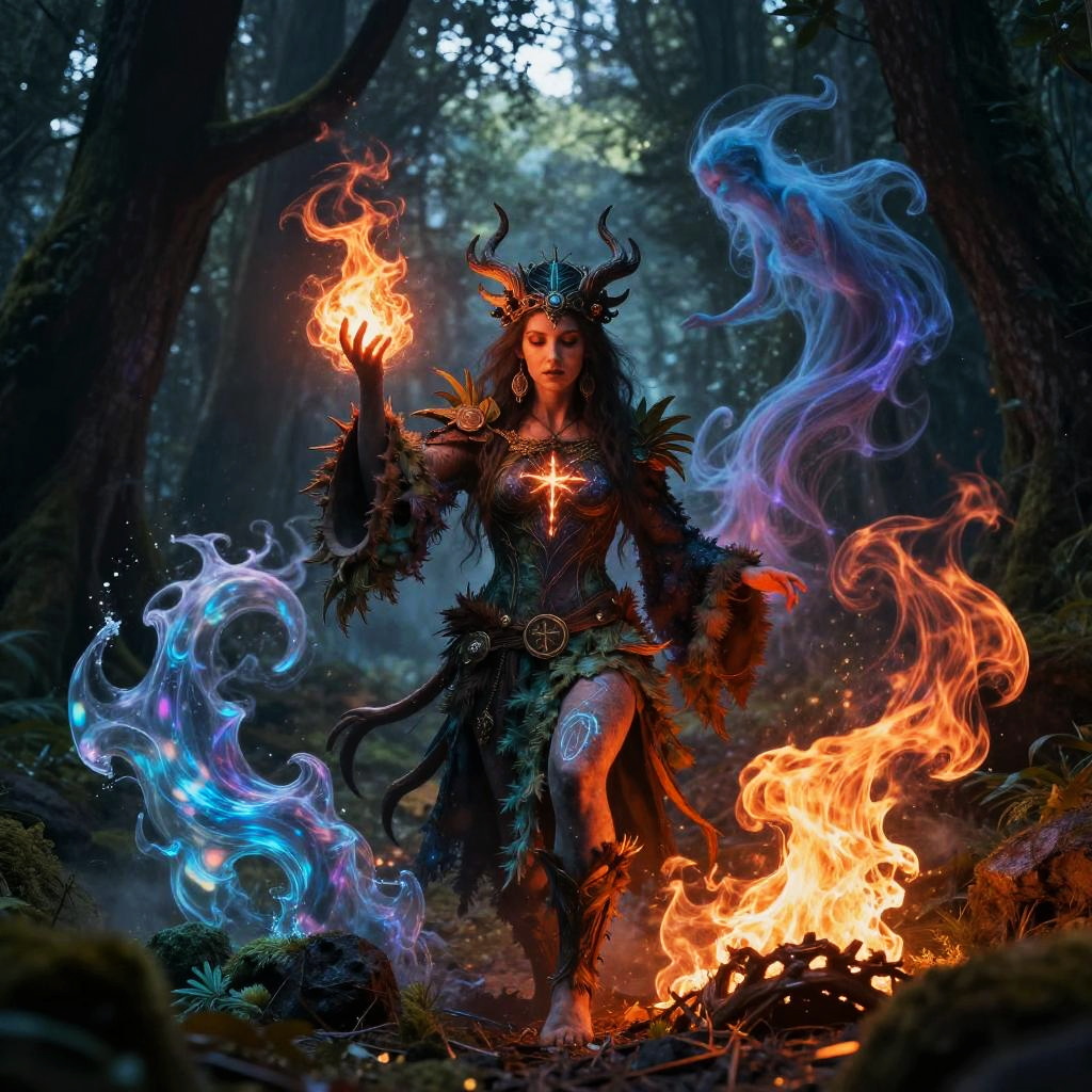Witchin summoning elemental spirits in a dark enchanted glade, surrounded by swirling fire, water, earth, and air elements forming ghostly shapes, vibrant colors and dynamic motion, intricate costume with natural motifs and glowing symbols, atmospheric and epic.