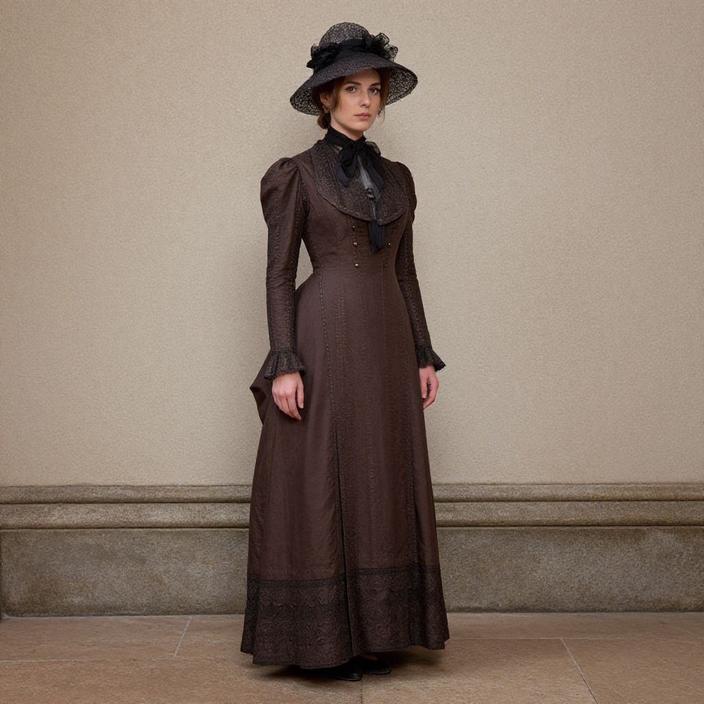 "Victorian Fantasy Dress, woman in a brown dress and hat standing in front of a wall"