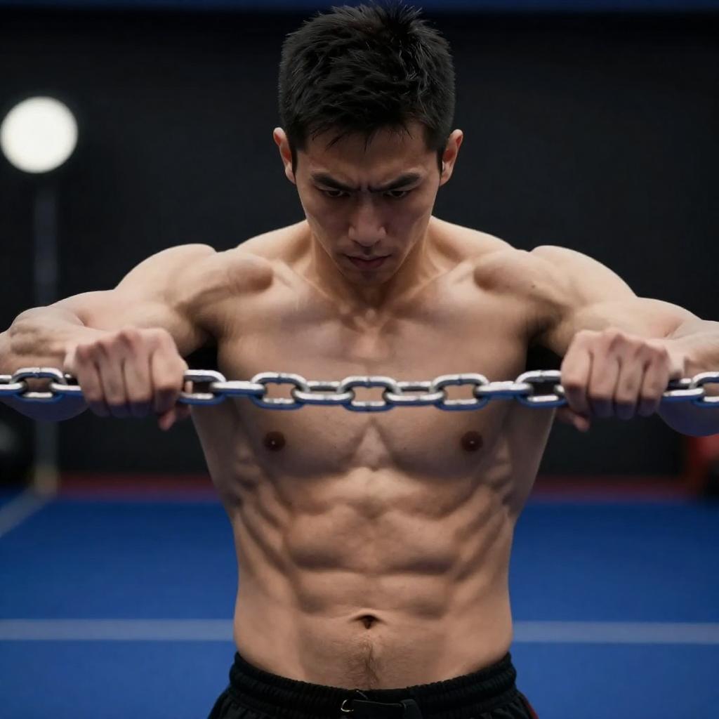 Photograph of a muscular, shirtless Asian man with short black hair, extending his arms forward in a dynamic pose. He is illuminated by dramatic lighting, highlighting his defined muscles and tanned skin. The background is dark and blurred, with indistinct objects and a circular table. The man's intense expression and focused stance suggest a moment of action or performance.