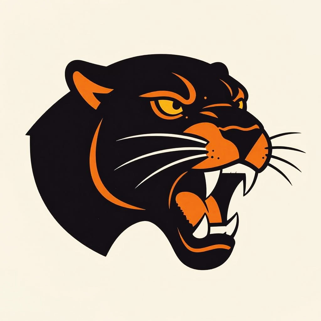 A vintage style print of a roaring black panther head with bold graphic lines and limited orange and black color palette, retro school logo style on textured off-white background