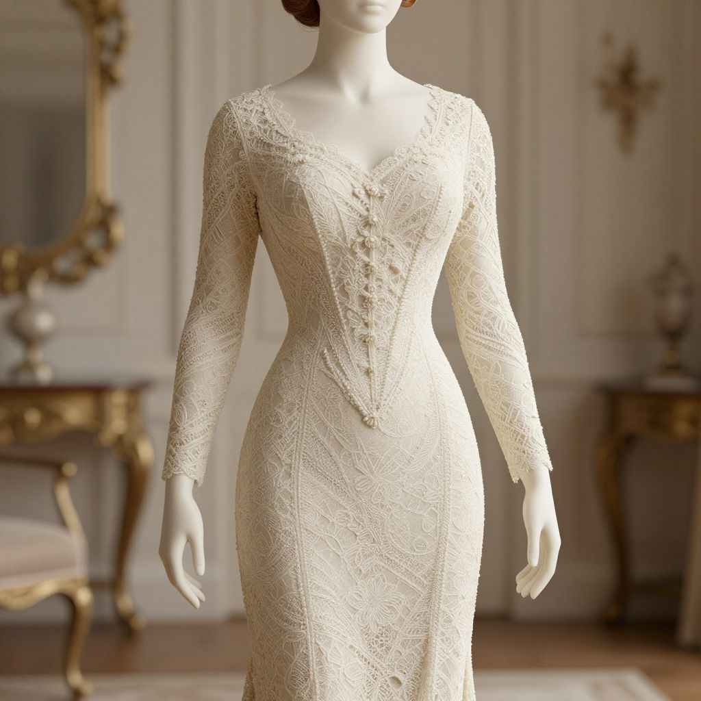 Photorealistic CGI of a white, lace, long-sleeved, V-neck, form-fitting wedding dress on a headless mannequin