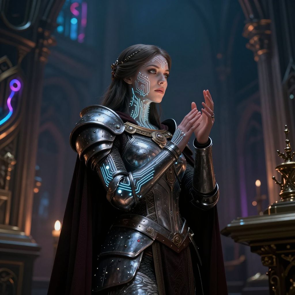 Female techpriest adorned with glowing circuit tattoos, wearing a blend of medieval and futuristic armor, chanting before a mechanical altar in a cathedral of steel and neon lights, high detail and intense mood