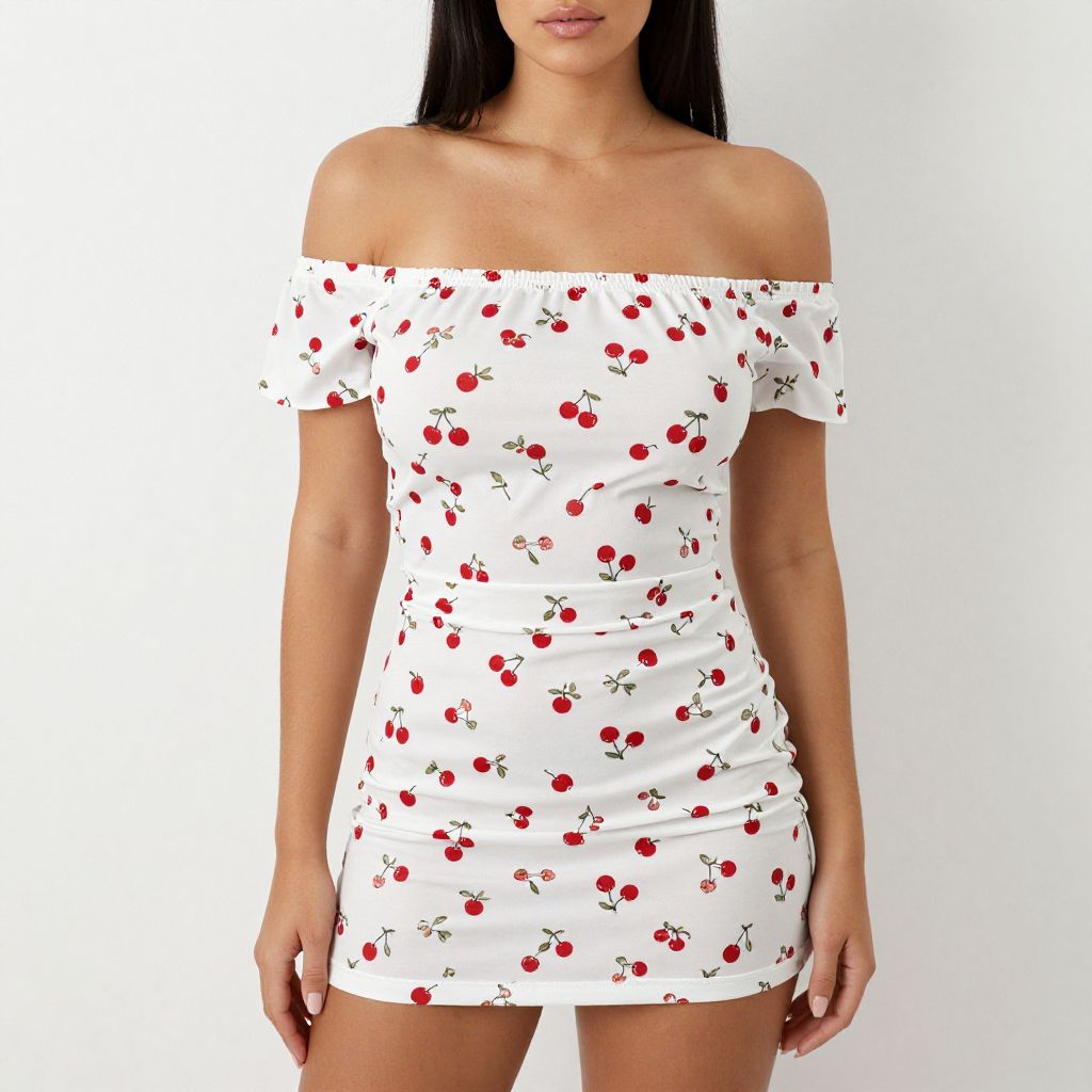 Photograph of a woman with long black hair, wearing an off-the-shoulder, white mini dress adorned with a red cherry pattern. The dress has short, ruffled sleeves and fits snugly, accentuating her slim figure. Her skin tone is light brown. The background is plain white, making her and the dress stand out. Her face is partially visible, with a neutral expression. The overall style is casual and summer-appropriate, with a playful and feminine touch.