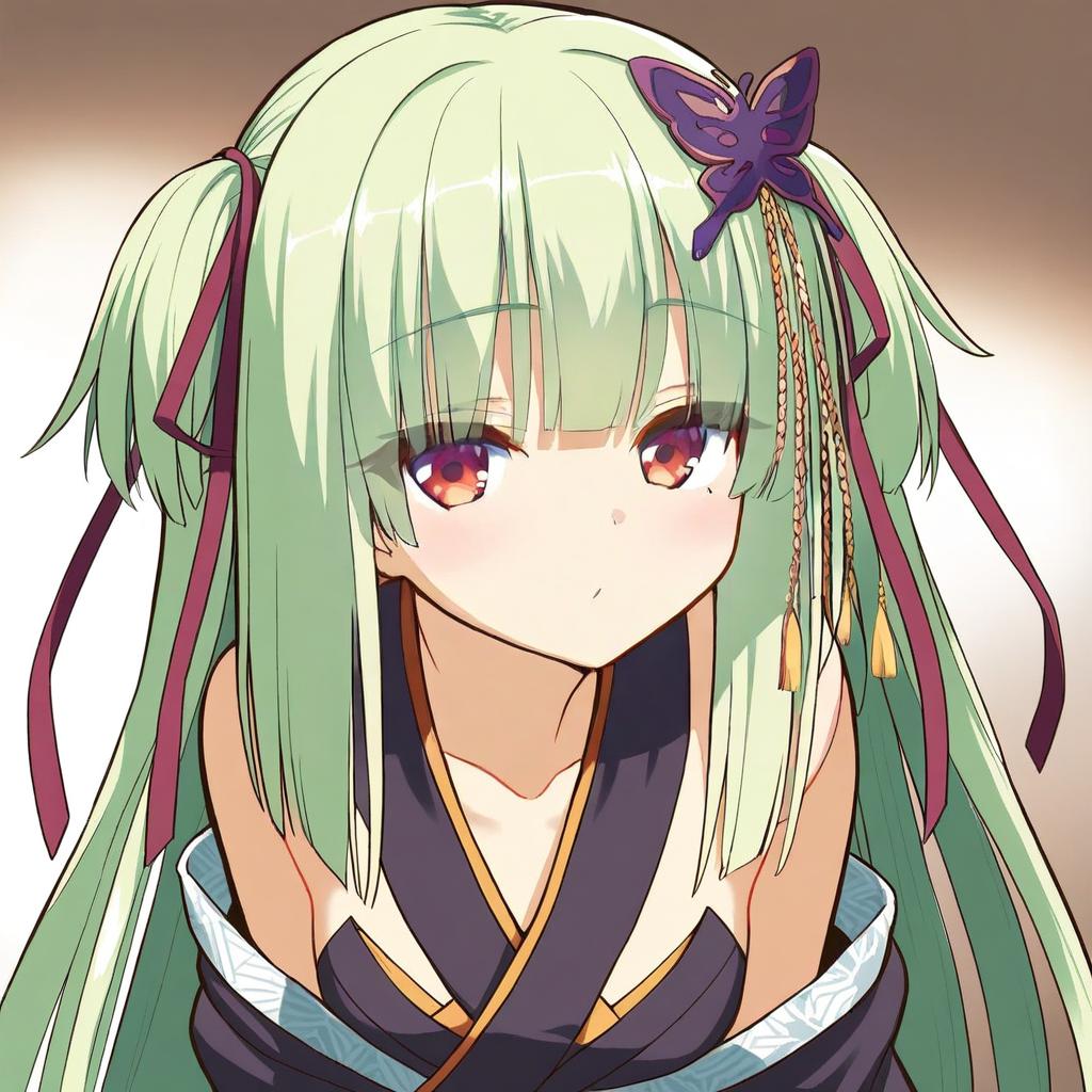 This is a digital anime-style drawing of a young girl with long, pale green hair tied in two low pigtails with purple ribbons and a purple butterfly hairpin. Her large, red eyes gaze slightly downward with a calm expression. She wears a dark blue, off-shoulder kimono with gold trim, revealing her shoulders and collarbone. The background is a gradient from dark brown to white, highlighting her face. The image has a soft, glowing effect around her head, adding a gentle, ethereal quality.