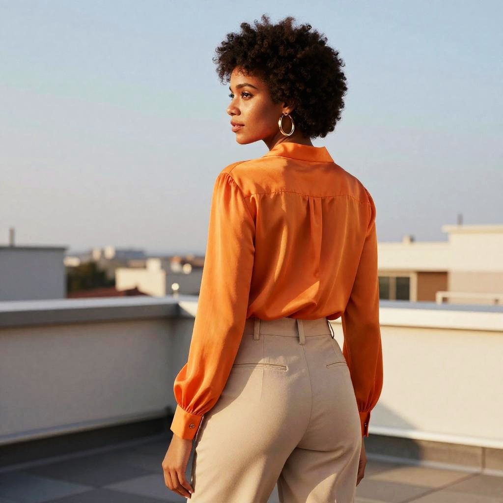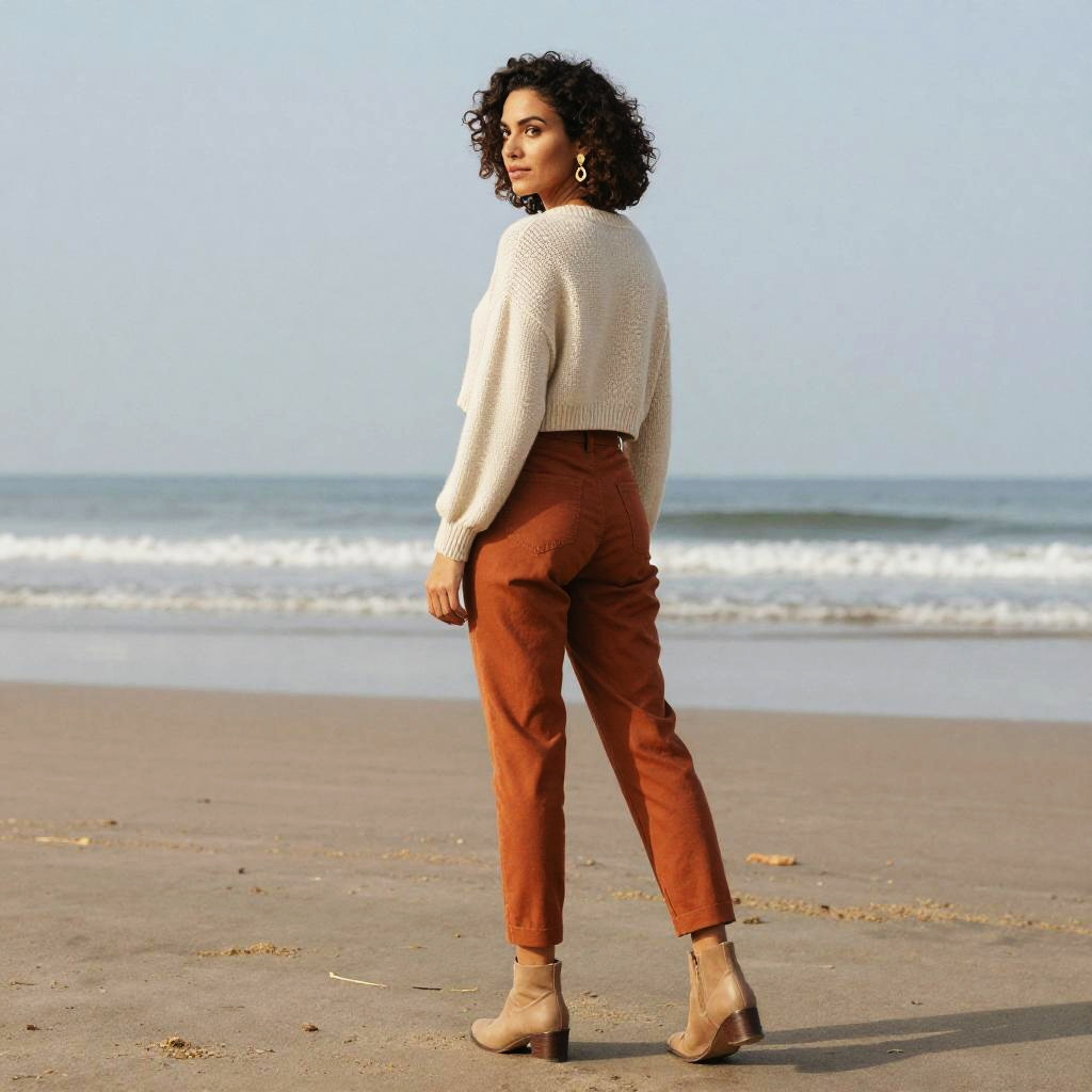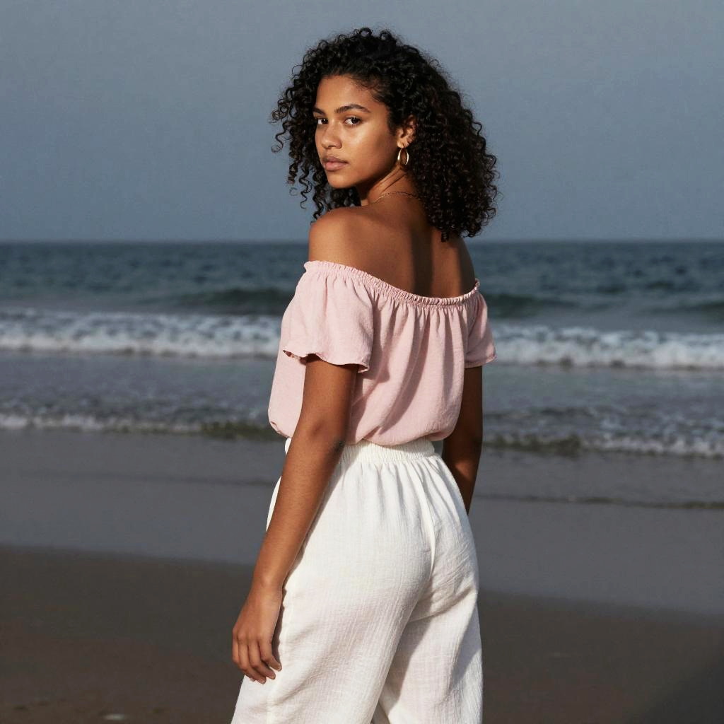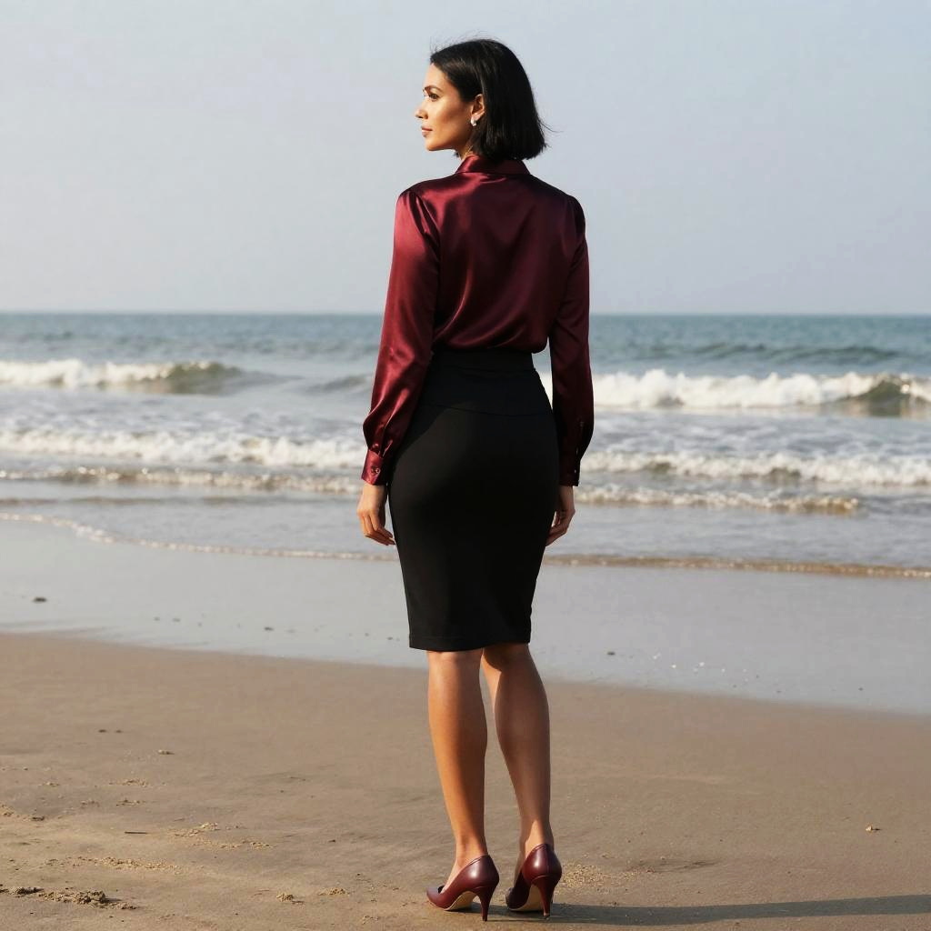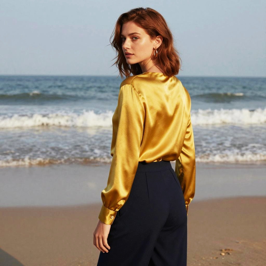 Photograph in a refined fashion editorial mood, natural color, soft directional light, clean contrast, SDXL, photoreal. young woman with light brown skin and shoulder-length auburn hair stands with back to camera, head turned left to glance over shoulder, poised and confident. Location is dawn beach, with balanced framing and subtle film grain. Wardrobe details: mustard yellow satin blouse, navy wide-legged pants, bronze hoop earrings.