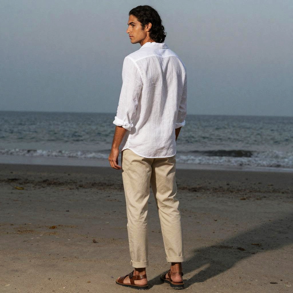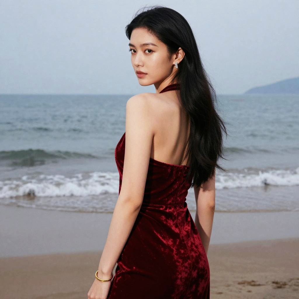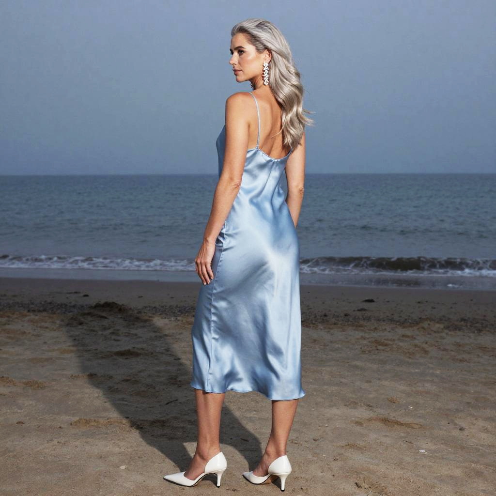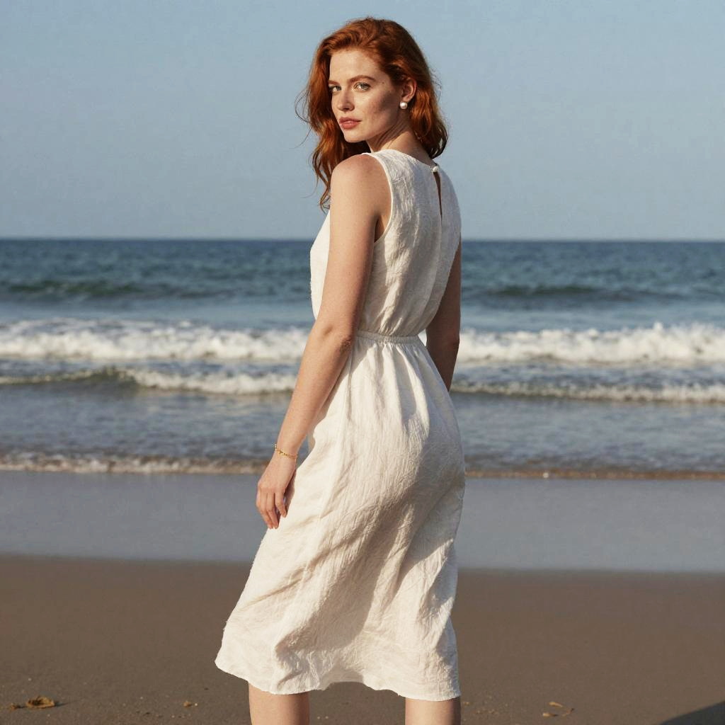 Photograph in a refined fashion editorial mood, natural color, soft directional light, clean contrast, SDXL, photoreal. young woman with light brown skin and shoulder-length auburn hair stands with back to camera, head turned left to glance over shoulder, poised and confident. Location is dawn beach, with balanced framing and subtle film grain. Wardrobe details: mustard yellow satin blouse, navy wide-legged pants, bronze hoop earrings.