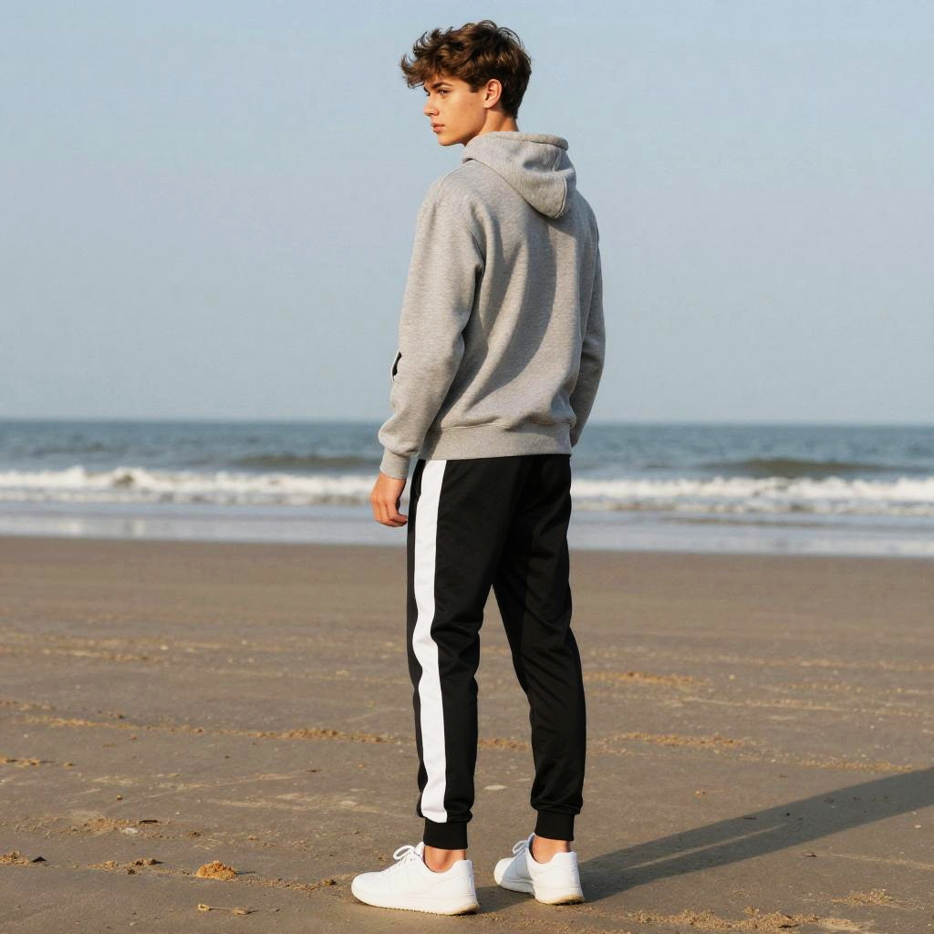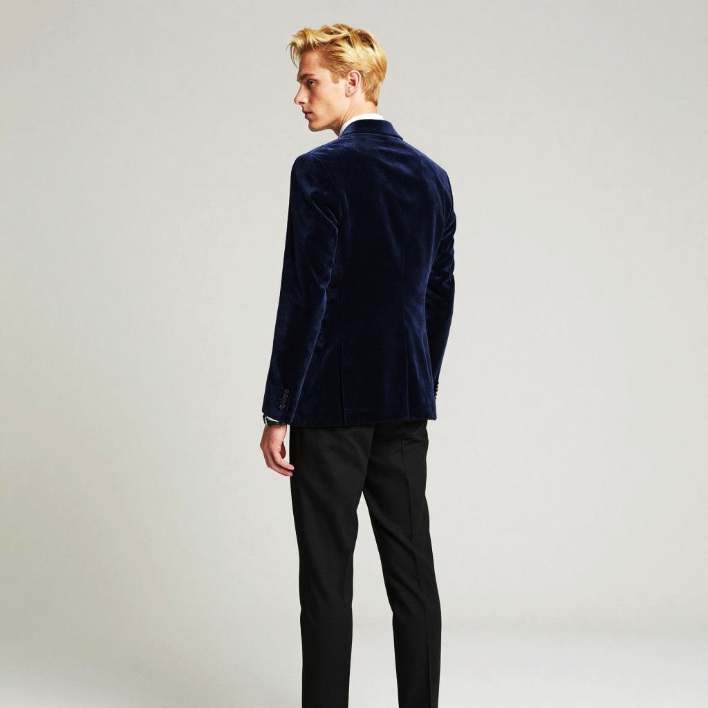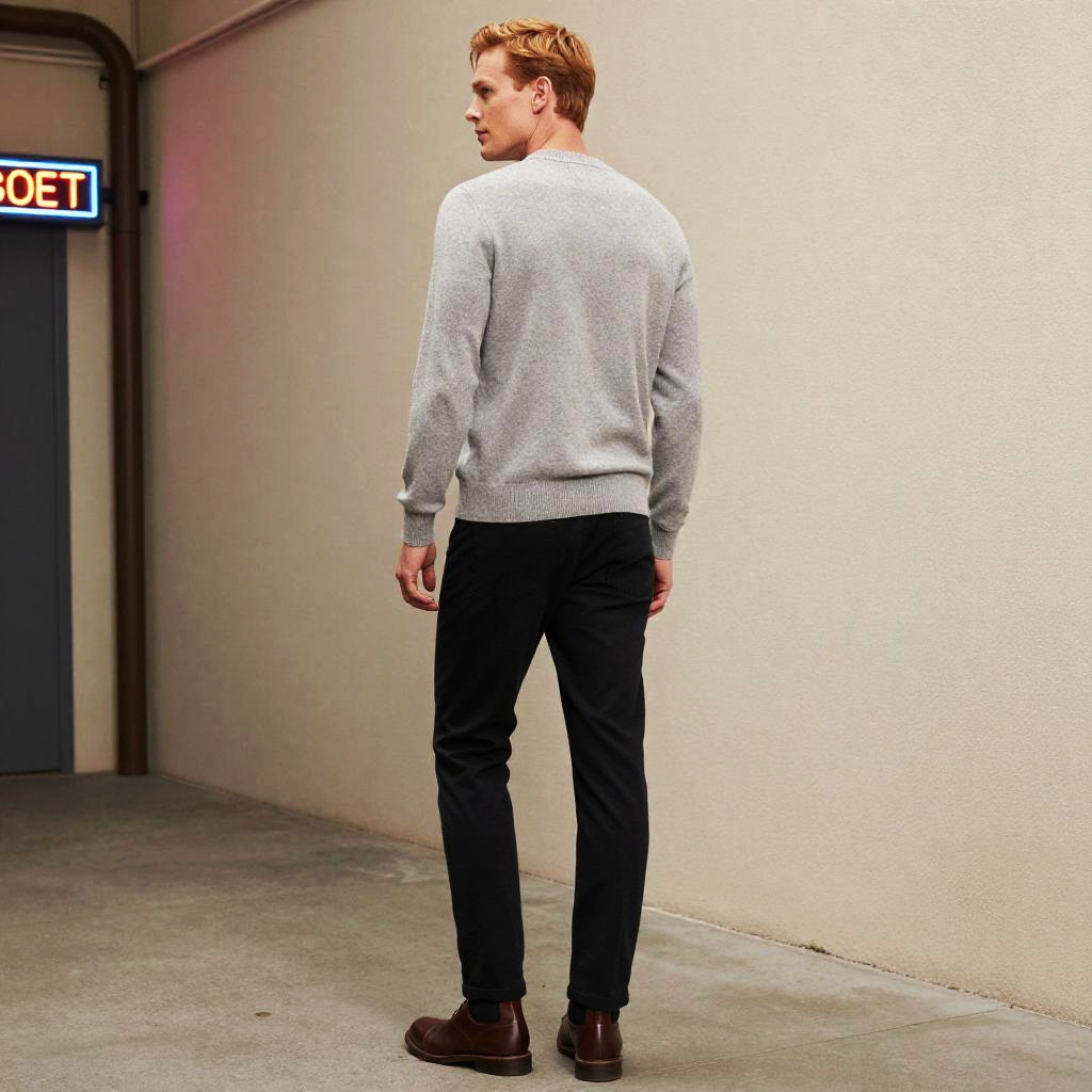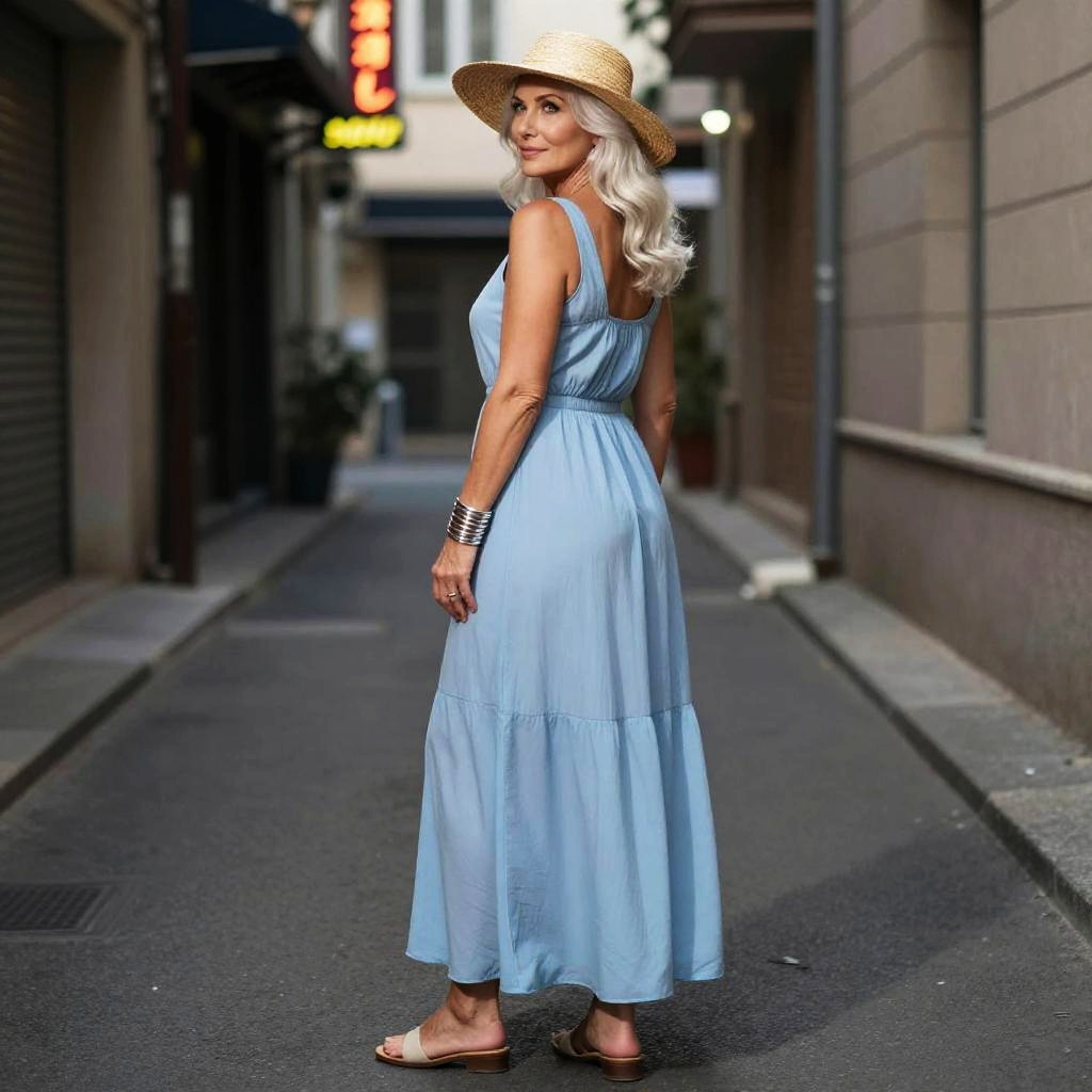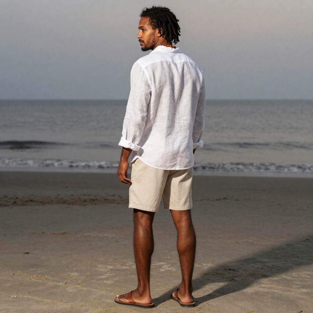 Photograph in a refined fashion editorial mood, natural color, soft directional light, clean contrast, SDXL, photoreal. young woman with light brown skin and shoulder-length auburn hair stands with back to camera, head turned left to glance over shoulder, poised and confident. Location is dawn beach, with balanced framing and subtle film grain. Wardrobe details: mustard yellow satin blouse, navy wide-legged pants, bronze hoop earrings.
