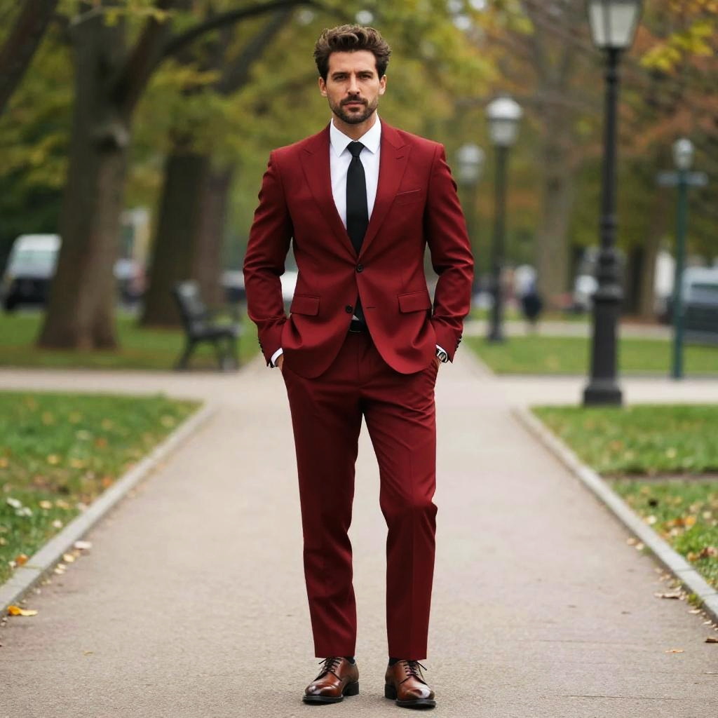 Photograph of a handsome man with dark hair and a trimmed beard standing confidently on a park path. He's wearing a sharp, deep red suit, white shirt, black tie, and brown leather shoes. His hands are in his pockets, and he's looking directly at the camera. The background shows a blurred park with trees, grass, and street lamps. The overall vibe is stylish and sophisticated.