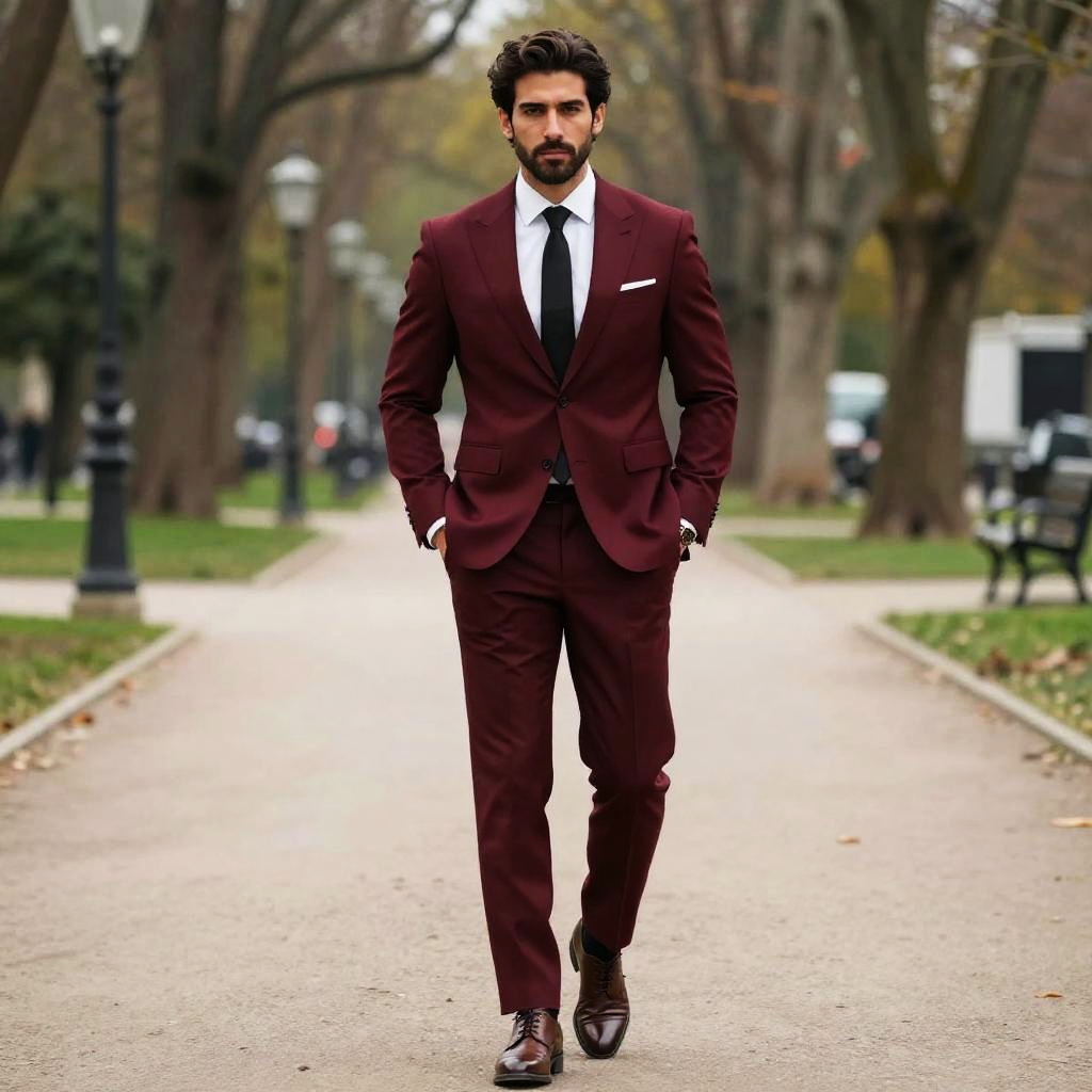 Photograph of a handsome man with dark, wavy hair and a neatly trimmed beard, walking down a tree-lined park path. He wears a fitted, dark maroon suit with a white dress shirt and black tie, complemented by brown leather dress shoes. His hands are in his pockets, exuding confidence. The park path is paved and flanked by green grass and tall, bare trees, with blurred park benches and street lamps in the background. The overall mood is sophisticated and stylish, with a focus on the man's polished appearance against the natural, slightly overcast park setting.