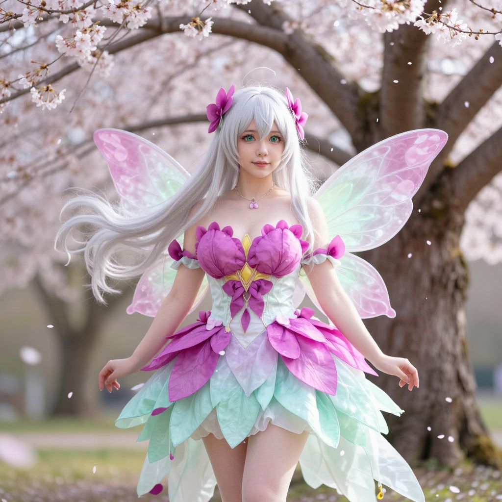 A radiant young woman with long flowing silver hair and large, expressive green eyes, wearing a magical Flower Fairy costume composed entirely of soft, floating petals that shift in color from magenta to mint green, standing beneath an ancient cherry blossom tree in a enchanted garden, petals drifting down slowly around her, glowing faintly in the morning sunlight.. The woman has big tits and cute face