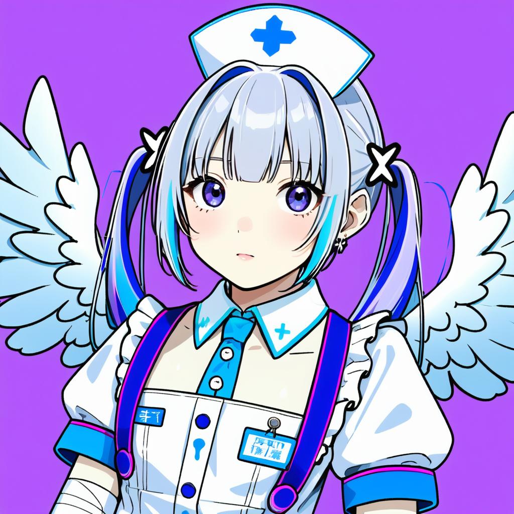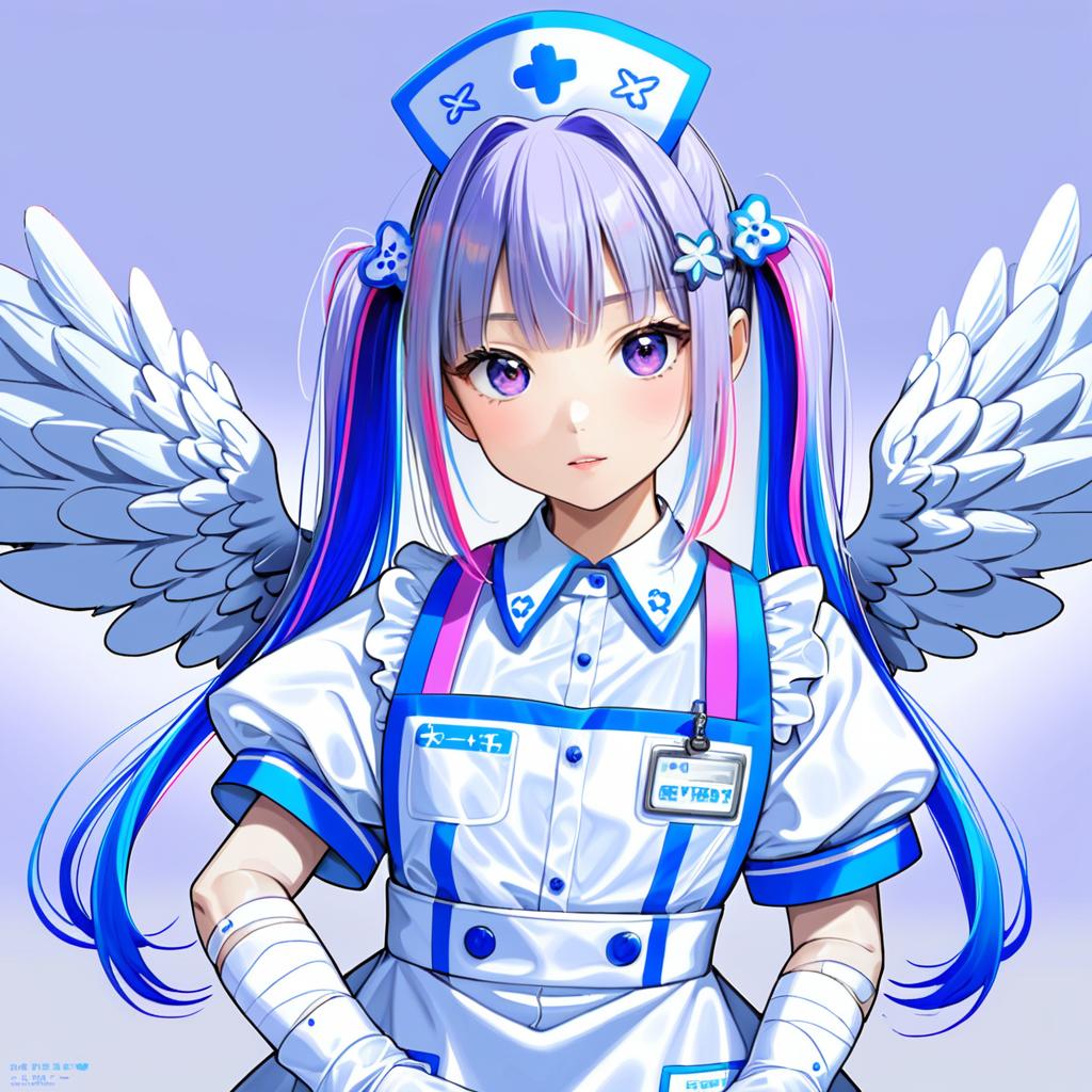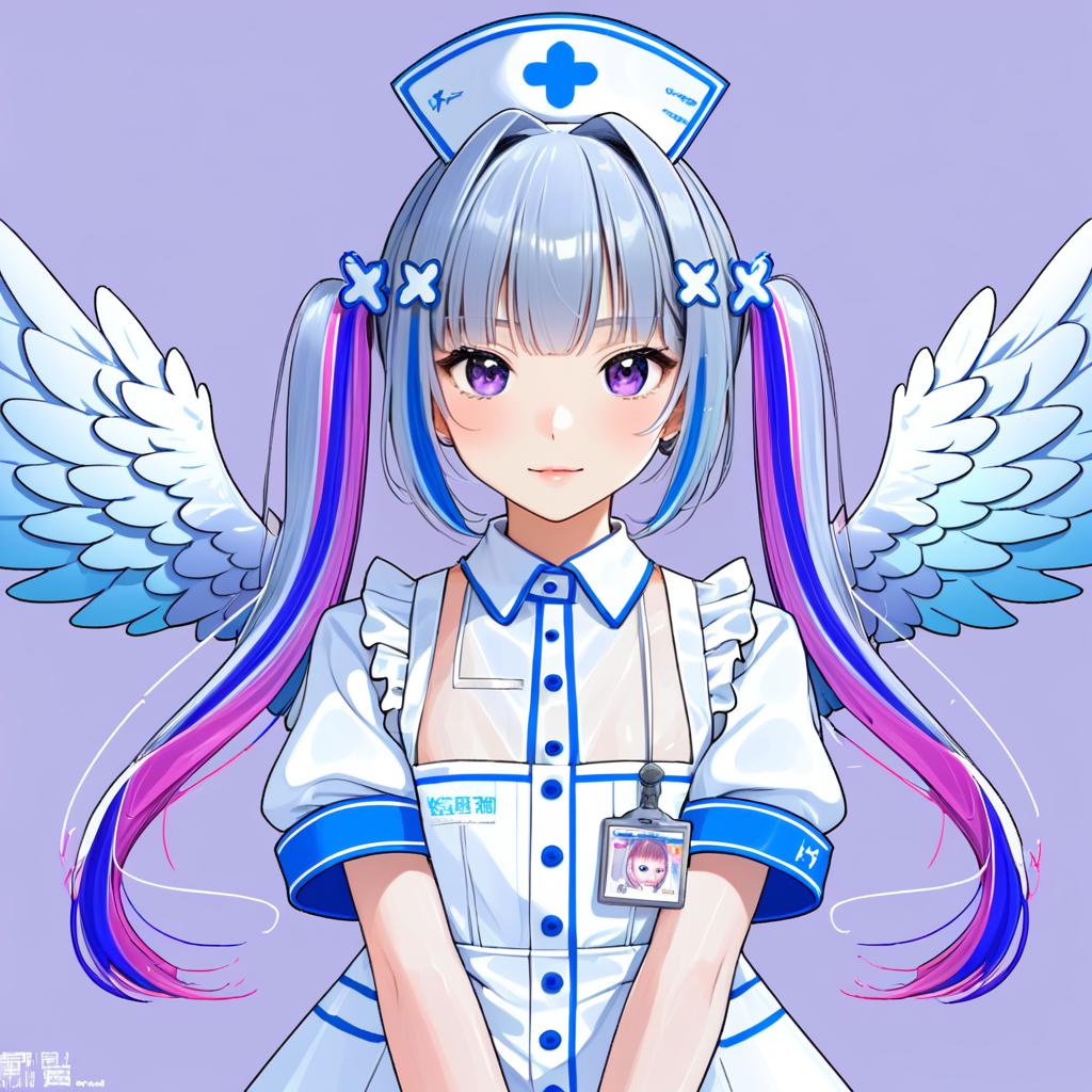 Amane kanata (nurse), hololive, 1girl, angel wings, angel wings, purple eyes, blue hair, grey hair, colored inner hair, single hair intake, official alternate hairstyle, streaked hair, official alternate hair length, long hair, pink hair, x hair ornament, twintails, blunt bangs, small breasts, flat chest, nurse cap, white gloves, white dress, white apron, detached collar, puffy short sleeves, virtual youtuber, virtual youtuber, feathered wings, feathered wings, nurse, nurse, bandaged arm, id card, armband, by artist ikeda jun (mizutamari), anime