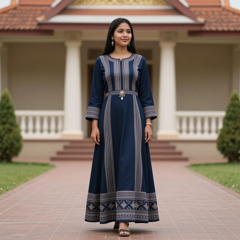 Photograph of a young South Asian woman standing on a brick pathway in front of a traditional temple with white columns and a red-tiled roof. She has long, straight black hair and medium brown skin. She is wearing a navy blue, long-sleeved, ankle-length traditional dress with intricate white embroidery on the front, sleeves, and hem. She has a slim build and is wearing black open-toed sandals. Her expression is neutral, and she stands with her hands by her sides. The background includes green shrubs on either side of the pathway.