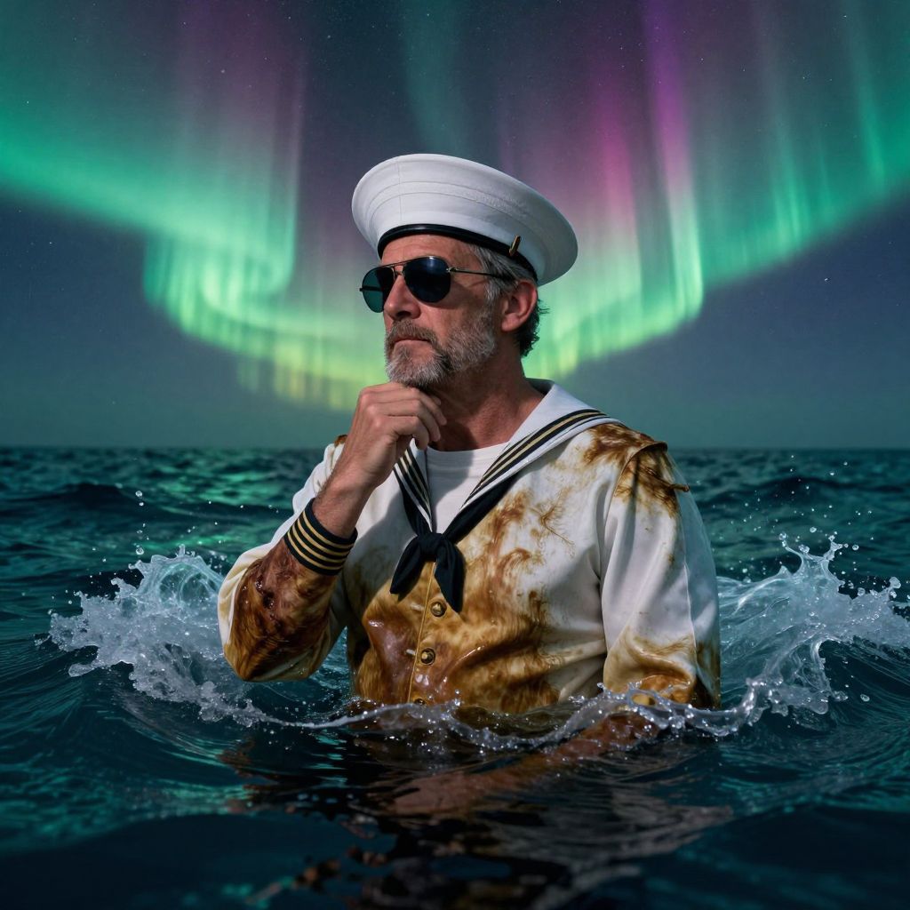 A mature gentleman, his features cloaked in thought, is enveloped by translucent waves seemingly pulled from the sea itself. Vibrant aurora borealis ribbons swirl and dance around him, creating a captivating display against the starlit ocean backdrop. The elegant yet weathered naval uniform he wears blends seamlessly with the natural hues of the aurora, weaving a rich tapestry of colors and textures. This scene evokes a sense of tranquility and mystery, inviting viewers to ponder the untold tales of his life at sea and the secrets hidden within.