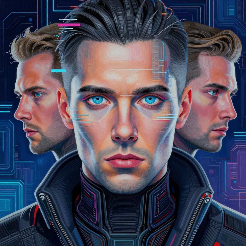 This is a digitally created CGI image featuring three white men with short, spiked brown hair and beards, wearing futuristic, black, armored leather jackets with glowing blue and gold technological accents. The central figure, with intense blue eyes and a focused expression, stands front and center, flanked by two side profiles. The background is a highly detailed, metallic, sci-fi environment with vertical blue light panels, enhancing the futuristic theme. The men's jackets have intricate patterns and a sleek, high-tech design, adding to the overall cyberpunk aesthetic.