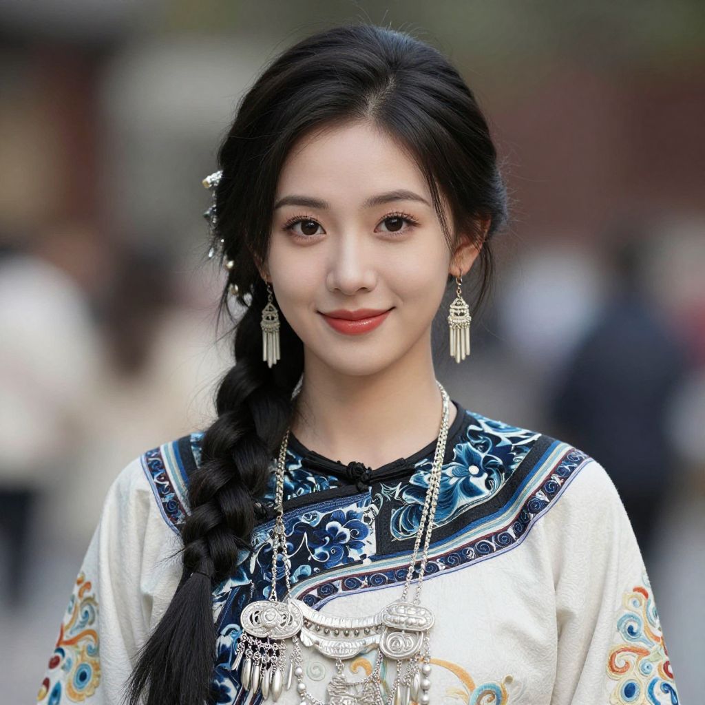 Photograph of a young Asian woman with fair skin and long, black hair in a side braid. She wears traditional, ornately embroidered Chinese clothing with a white top and blue, silver, and gold patterns. Her outfit features intricate silver embellishments on the chest and shoulders. She has dark, almond-shaped eyes, a small nose, and a gentle smile. She adorns long, dangling silver earrings. The background is blurred, showing an outdoor setting with indistinct people and greenery. The overall image has a soft focus, highlighting her serene expression and traditional attire.