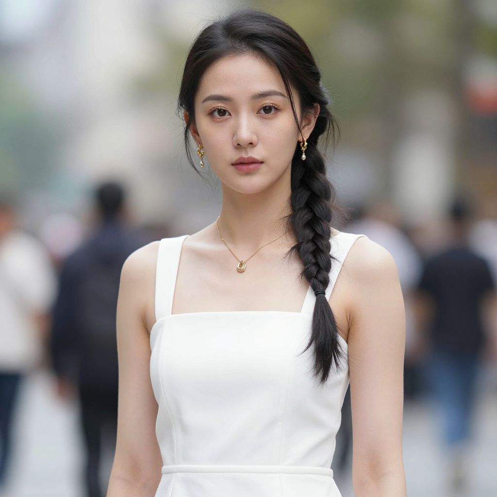 Photograph of an Asian woman with long black hair in a braid, wearing traditional embroidered blue and white Chinese attire, silver earrings, and a subtle