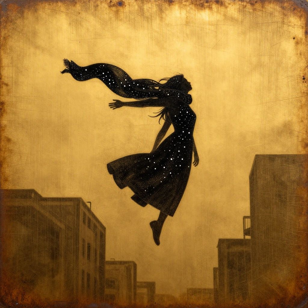 ( a minimalist etching by hand on scratched and rusty metal, photo-realistic surface:1.3), view from below, a person with flowing scarf flying between buildings, levitating, clothes like midnight full of stars, captured in motion, real gold background.Only 2 colors, real gold background and shadows