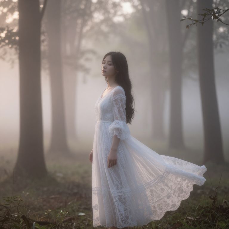 Photograph of an Asian woman with long black hair, wearing a white lace dress, standing in a misty forest, sunlight filtering through trees.