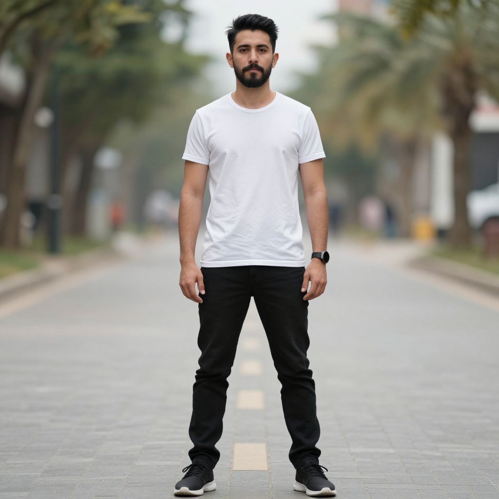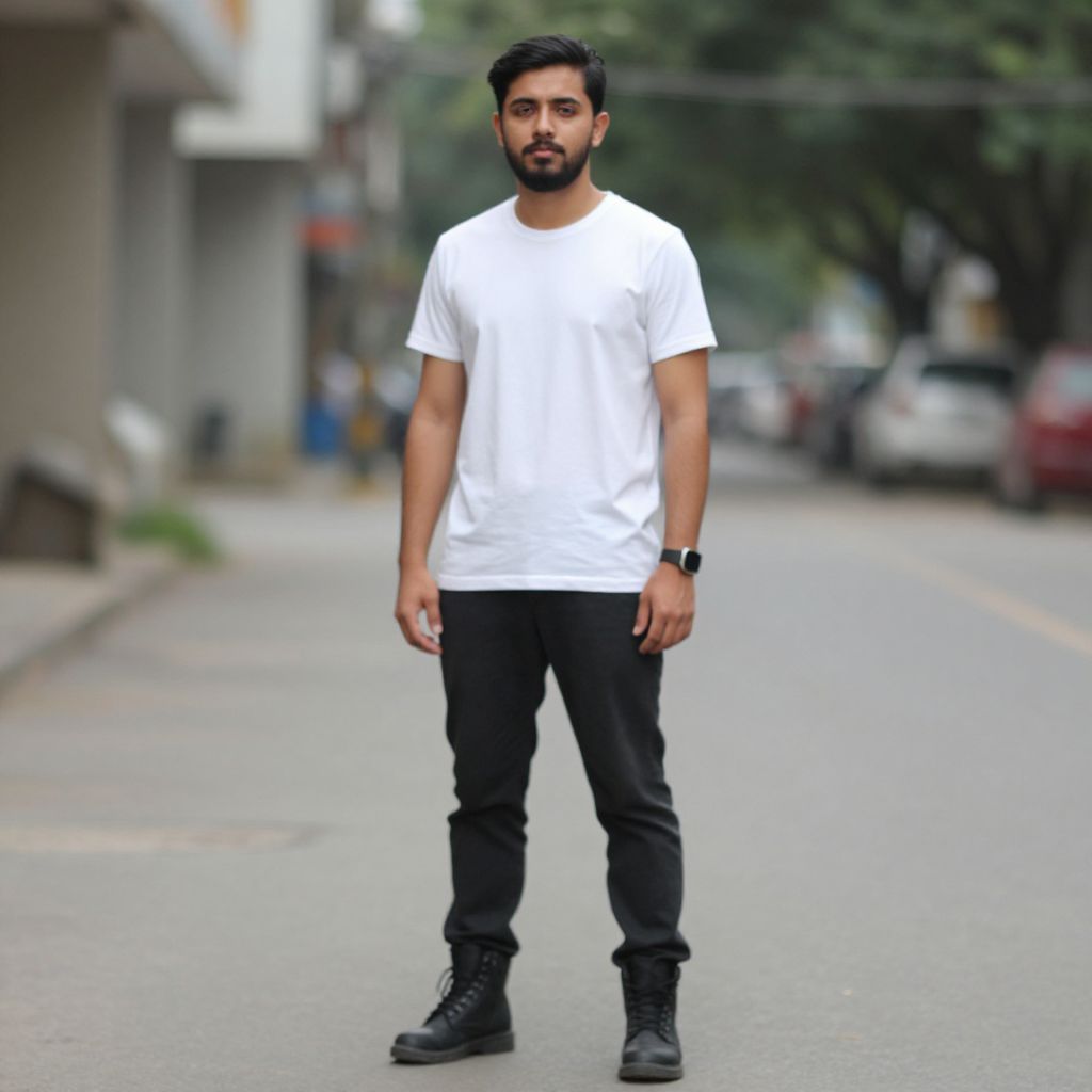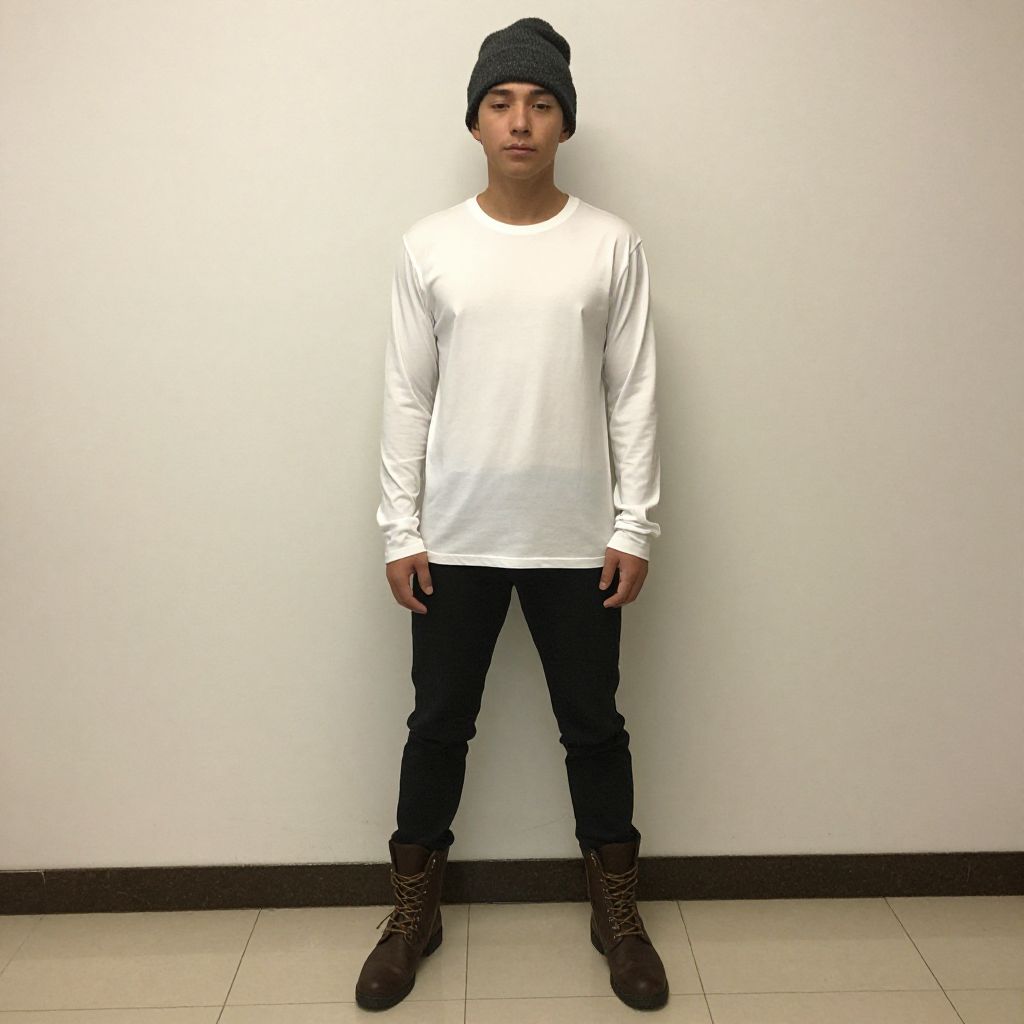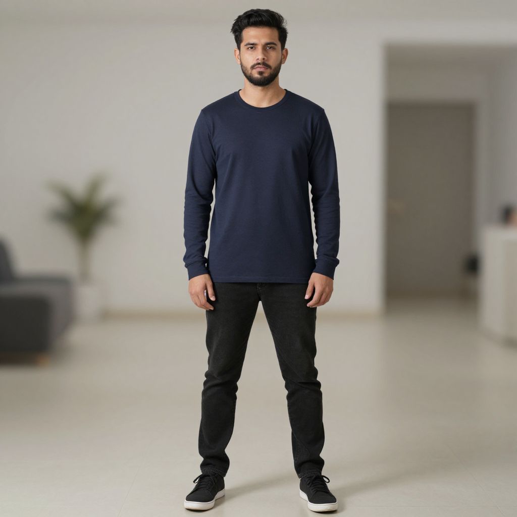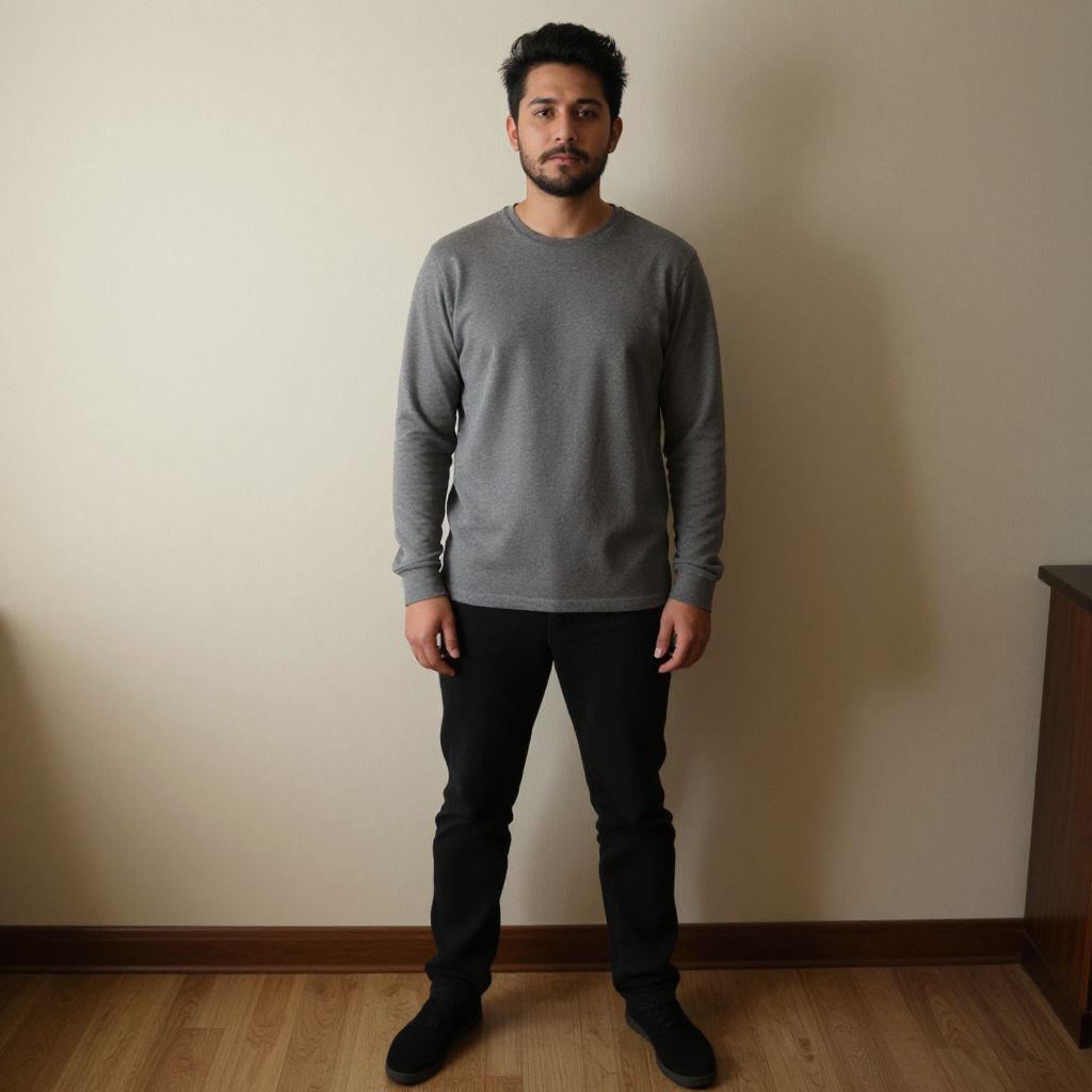 Photograph of a young man standing against a plain, light-colored wall. He has a medium build, dark short hair, and a trimmed beard. He wears a grey, long-sleeve sweater, black slim-fit pants, and black shoes. The floor is wooden with a brown baseboard. The lighting is even, casting a soft shadow behind him. The man's expression is neutral, and he stands with his arms relaxed by his sides. A small, dark wooden table is partially visible on the right side of the image.