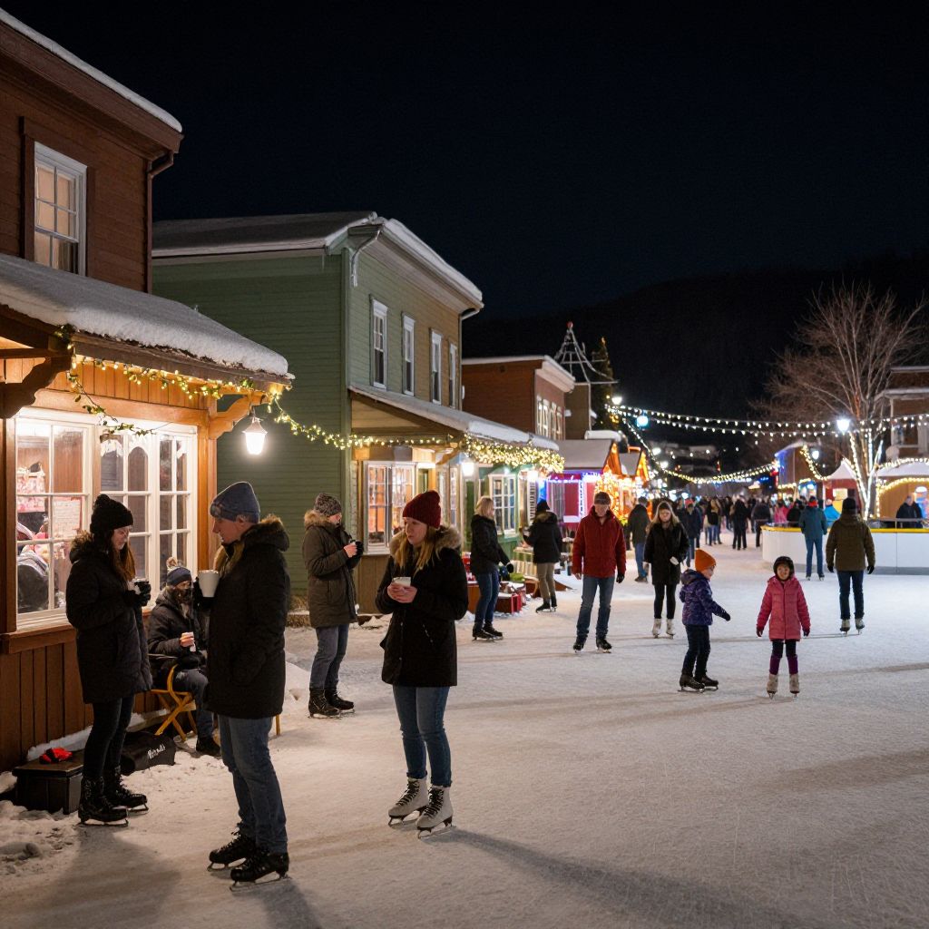 Northeastern small town winter festival at night, snow-covered streets illuminated by festive string lights, people enjoying hot drinks outside colorful wooden shops, children playing around an ice skating rink, cozy and cheerful holiday spirit conveyed.