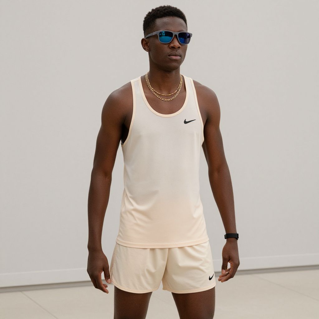 Photograph of a young black man with a lean, athletic build standing against a plain white wall. He has short, curly black hair and is wearing blue mirrored sunglasses. His outfit consists of a white Nike tank top with a small black Nike logo on the left chest, and matching white Nike shorts with a small black Nike logo on the right thigh. He also wears a gold chain necklace and a black wristwatch on his left wrist. The background is minimal, with the white wall and a light gray tiled floor. The lighting is bright and even.