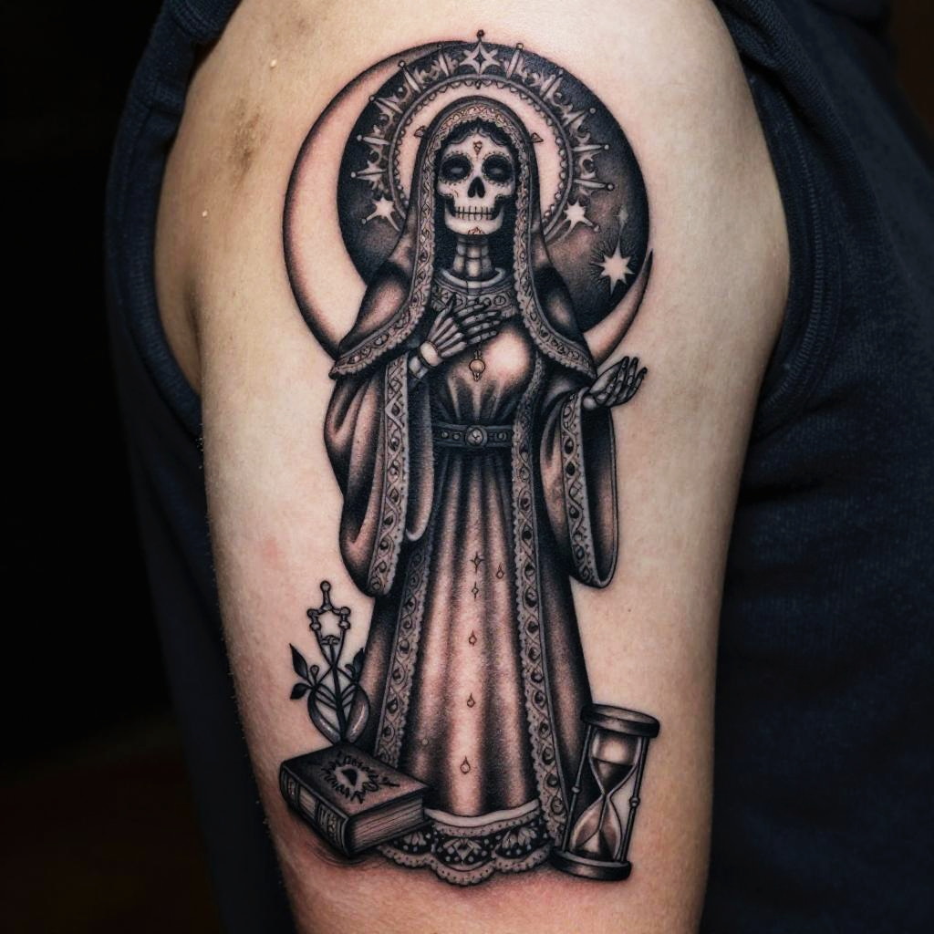 Dark and elegant Santa Muerte tattoo portrayal with the skeletal figure standing solemnly beneath a crescent moon, ornate halo, intricate filigree work around the robe edges, and symbolic items like a book and hourglass, blending realism and mystical art.