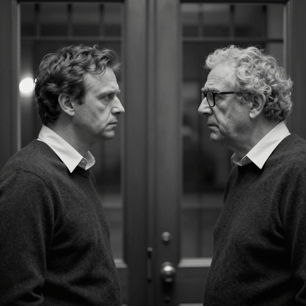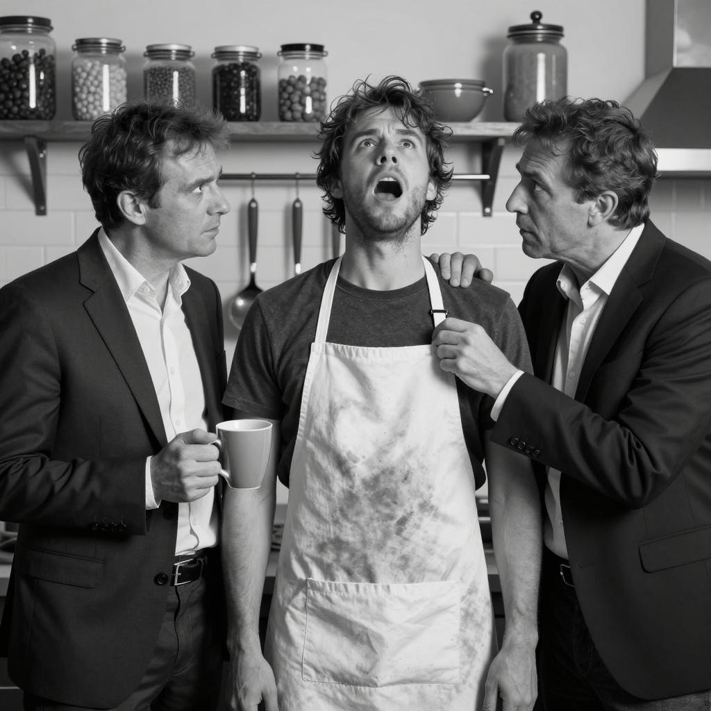 Three men leaning over the edge of a boat, hands on the boat's rim. The man in the center wears glasses and a black sweater, the man on the left wears a blue shirt, the man on the right wears a light gray sweater. All have intense expressions. Background shows blue water. All men have short, slightly messy hair. The man on the left has curly hair. The boat has a wooden structure. The man on the right has a beard.