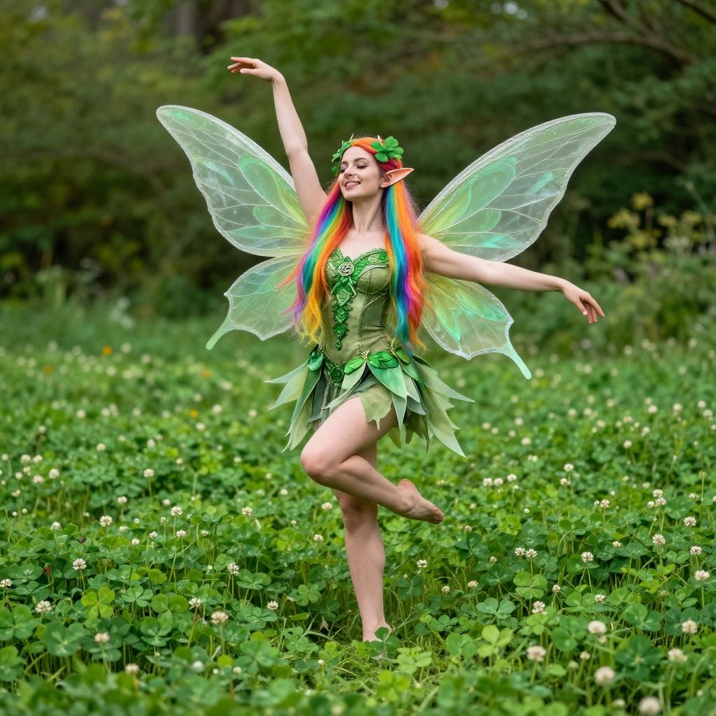 Female, long hair, rainbow hair, fairy, fairy_wings, pointed ears, dancing in field of clovers, Irish beauty, four-leaf clover, Celtic theme, hair_ornament, plant, nature, nature background, fantasy, magic, clover, full body, symmetry, green theme, SK_Fantasy, Playful, HD, masterpiece, best quality, hyper detailed, ultra detailed, super realistic