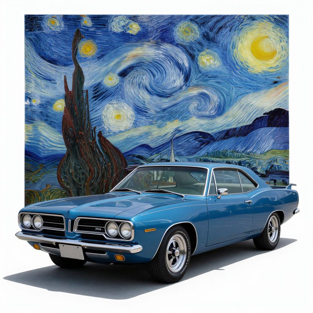 This digital artwork combines elements of Vincent van Gogh's "Starry Night" with a classic blue 1970s muscle car. The car, with its shiny blue paint and chrome accents, is positioned in the foreground, angled slightly to the right. Van Gogh's swirling blue and yellow night sky with prominent stars and a cypress tree is the background, blending the vibrant, textured style of his painting with the realistic rendering of the car. The car's headlights and chrome grille contrast with the dynamic, almost psychedelic background, creating a unique juxtaposition of modern automotive design and classic art.