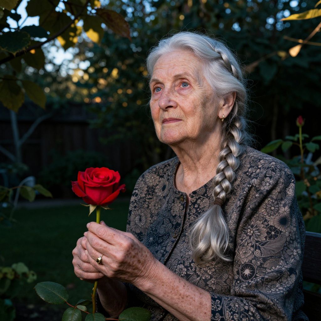 Photograph of an elderly white woman with long, silver braided hair, holding a vibrant red rose in her right hand. She has a delicate, wrinkled face with light blue eyes and is wearing a textured, black lace blouse. She is outdoors in a dimly lit garden with dark green foliage and a wooden fence in the background. The lighting highlights her facial features and the rose, creating a soft, warm glow. Her expression is serene and contemplative, with a slight smile. The image captures a moment of quiet beauty and reflection.