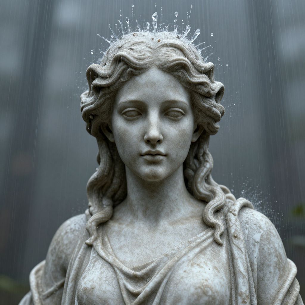 Photograph of a wet, gray stone statue of a serene, wavy-haired woman with a crown of water droplets, wearing a draped garment,