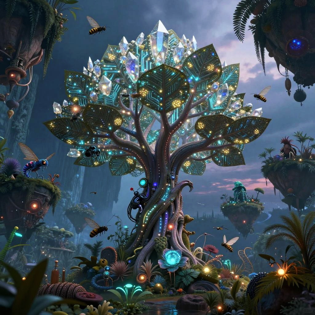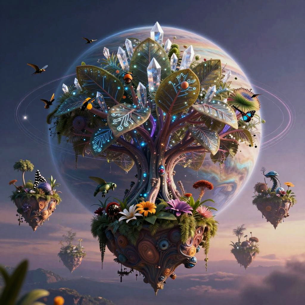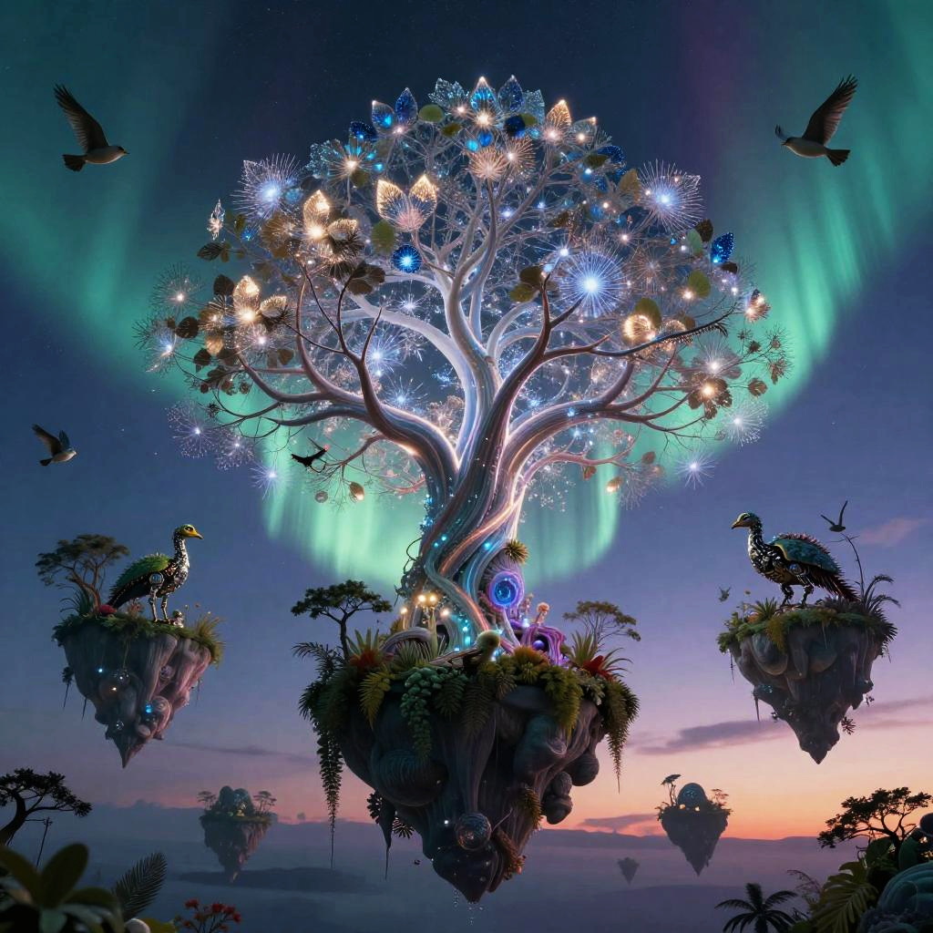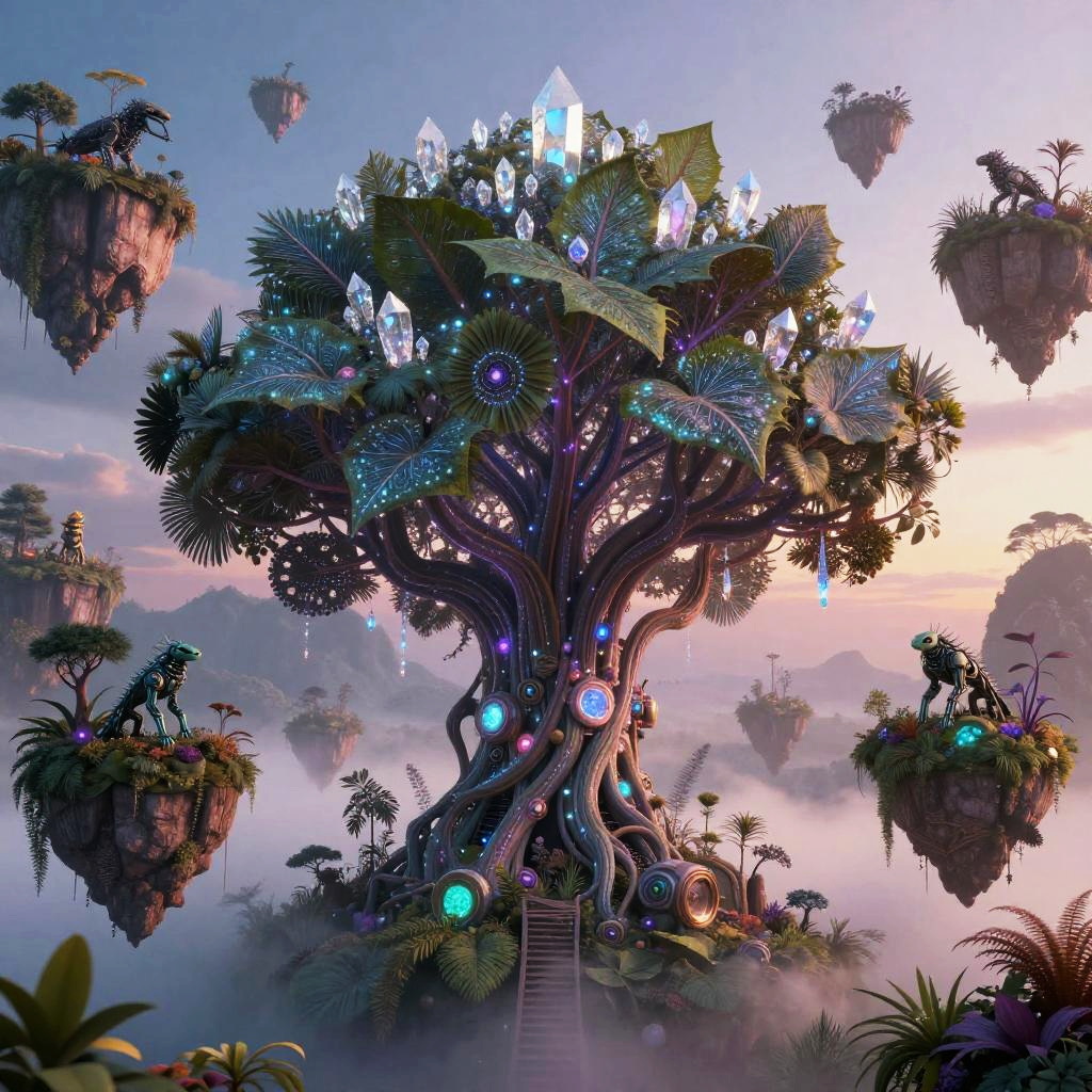 A futuristic city where the essence of urban culture coalesces with advanced technology: a colossal tree adorned with shimmering crystal and neon filaments, its leaves glowing softly with intricate patterns, surrounded by floating islands suspended in a twilight sky. Each island hosts an ecosystem that seamlessly merges organic life and mechanical creatures, creating a scene that evokes a sense of mystical wonder and the infinite possibilities of fusion between the organic and the synthetic.