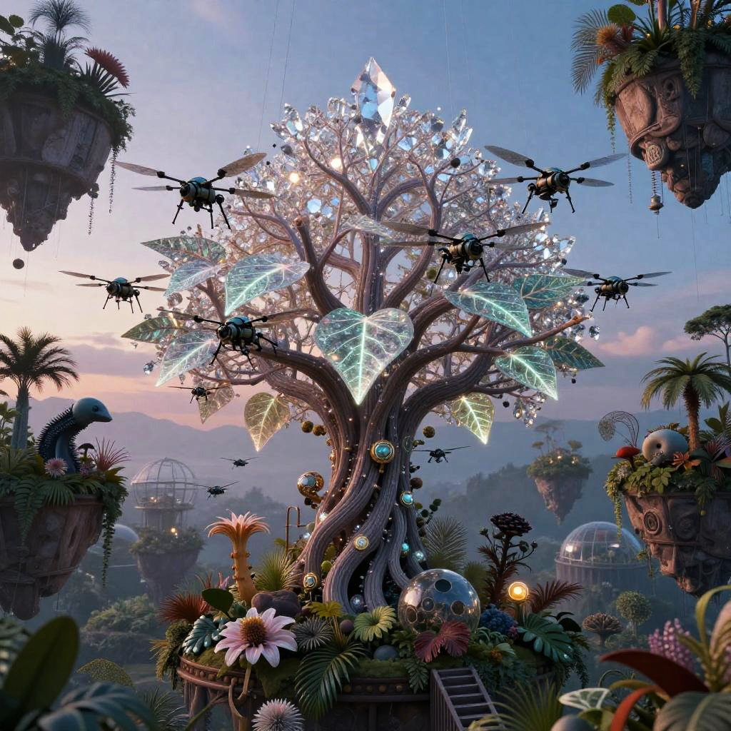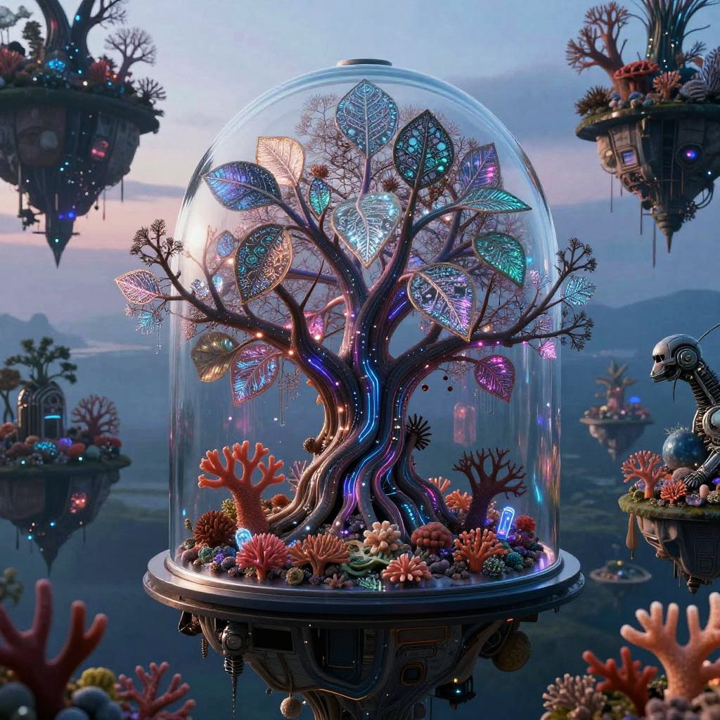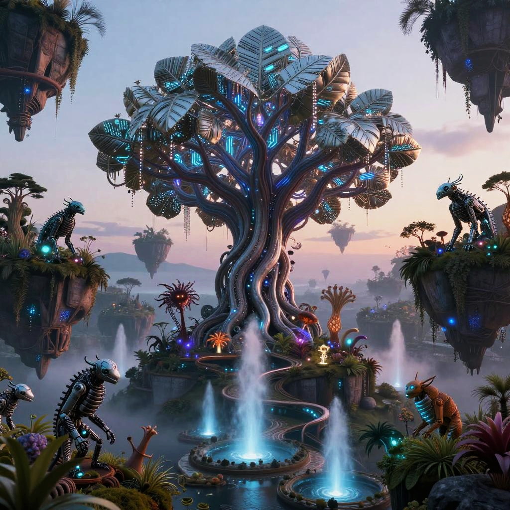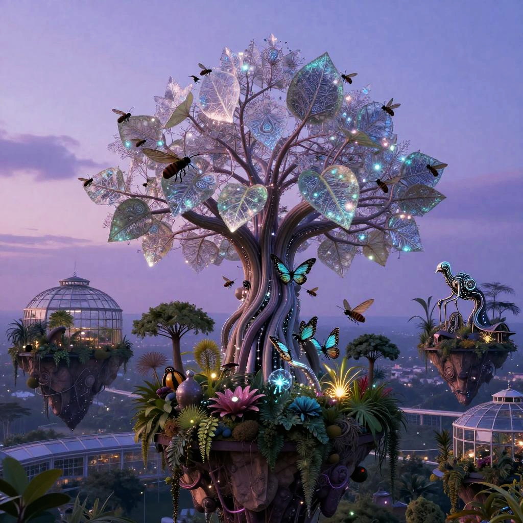 A futuristic city where the essence of urban culture coalesces with advanced technology: a colossal tree adorned with shimmering crystal and neon filaments, its leaves glowing softly with intricate patterns, surrounded by floating islands suspended in a twilight sky. Each island hosts an ecosystem that seamlessly merges organic life and mechanical creatures, creating a scene that evokes a sense of mystical wonder and the infinite possibilities of fusion between the organic and the synthetic.