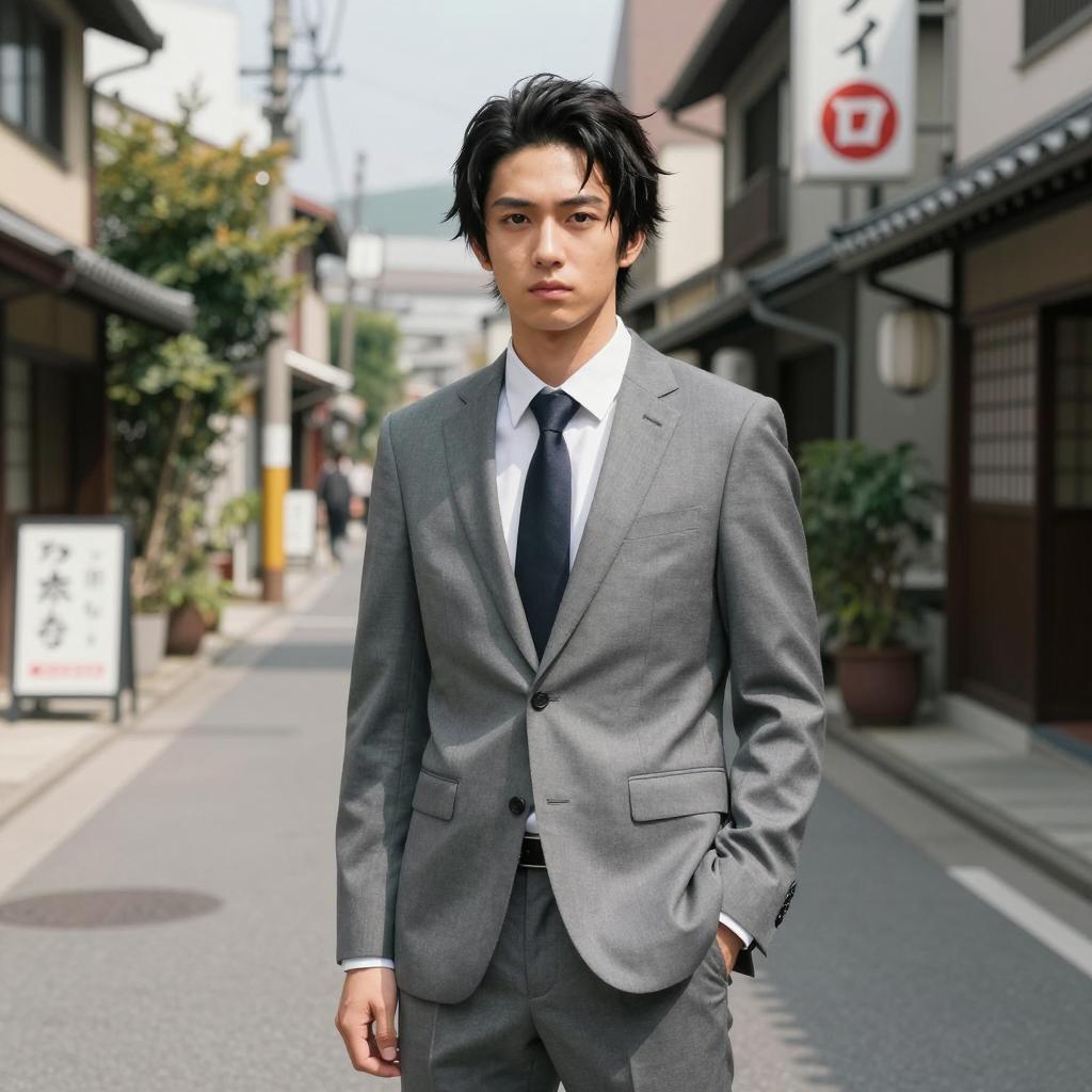 Tanjiro suit, photograph of handsome young Asian man, standing on narrow urban street, daytime, wearing grey suit with white shirt and dark tie, black hair, serious expression, sunlight casting shadows, blurry background with trees and buildings, traditional Japanese signage on the right, casual urban setting, professional attire, realistic style