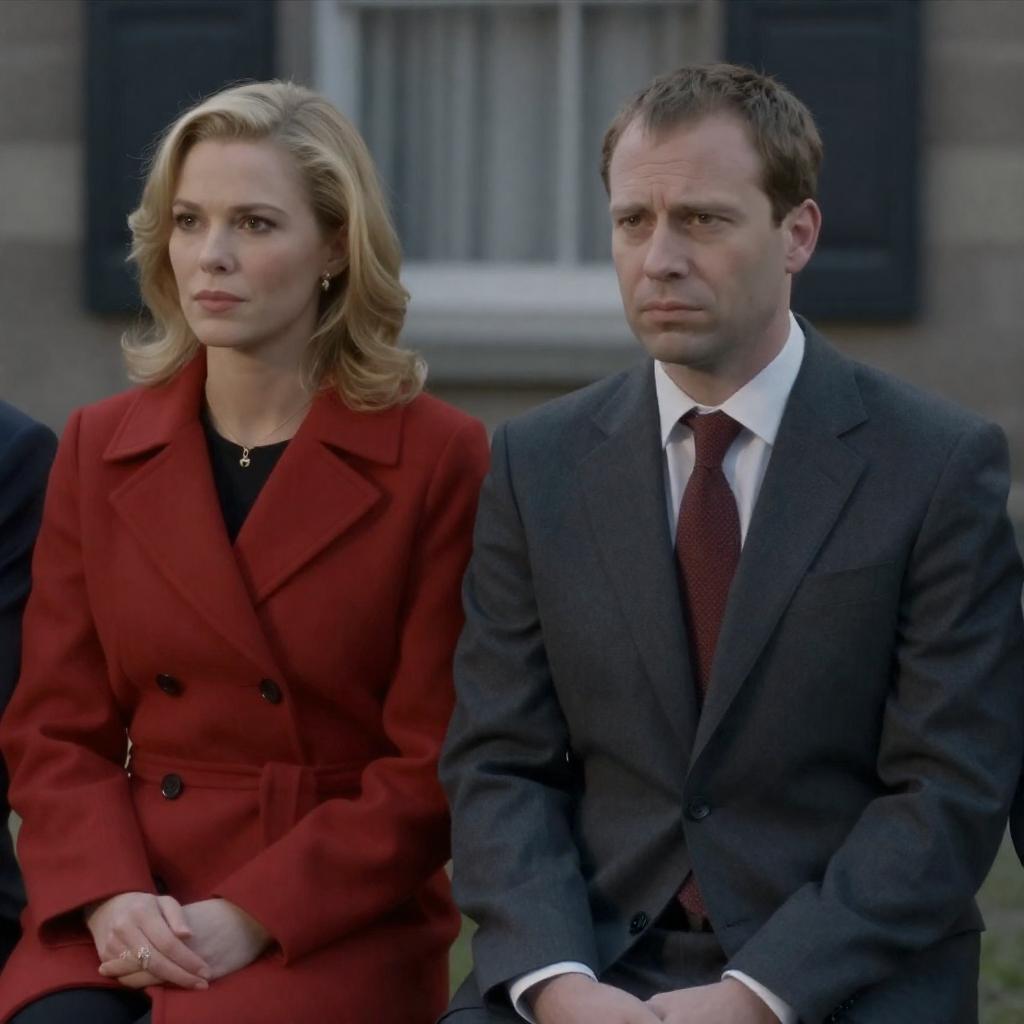 Photograph of a man and woman sitting close together. The man has short brown hair, wears a gray suit with a red tie, and has a serious expression. The woman has blonde hair, wears a red coat, and looks to the left. They are against a dark, blurred background with a window.