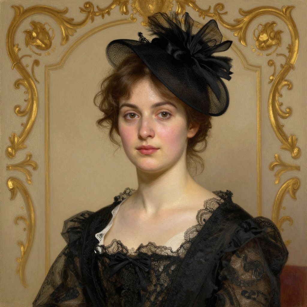 This is a digital painting of a young Caucasian woman with pale skin and brown, wavy hair styled in a loose updo. She wears a black lace dress with a low neckline, revealing a hint of white undergarment. A black, sheer, decorative hat with a large, feathered bow sits on her head. The background features an ornate, gold-framed, classical design with floral motifs. Her expression is calm and slightly melancholic, with soft pink blush on her cheeks. The overall style is reminiscent of 19th-century portraiture, emphasizing elegance and refinement.