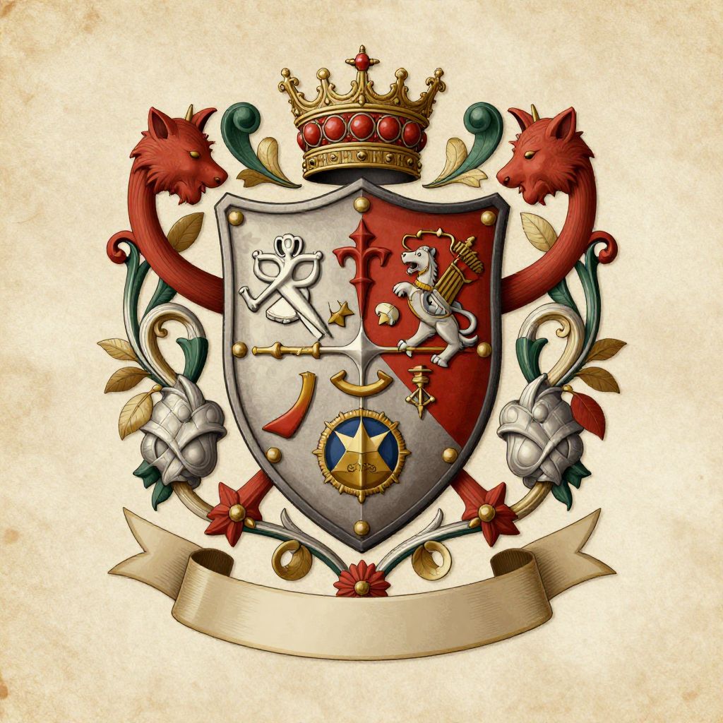 Family crest maker design showcasing an ornate medieval shield with intricate heraldic symbols, vibrant colors, elegant flourishes, and a classic banner at the bottom, set against a parchment textured background in a detailed and artistic style.