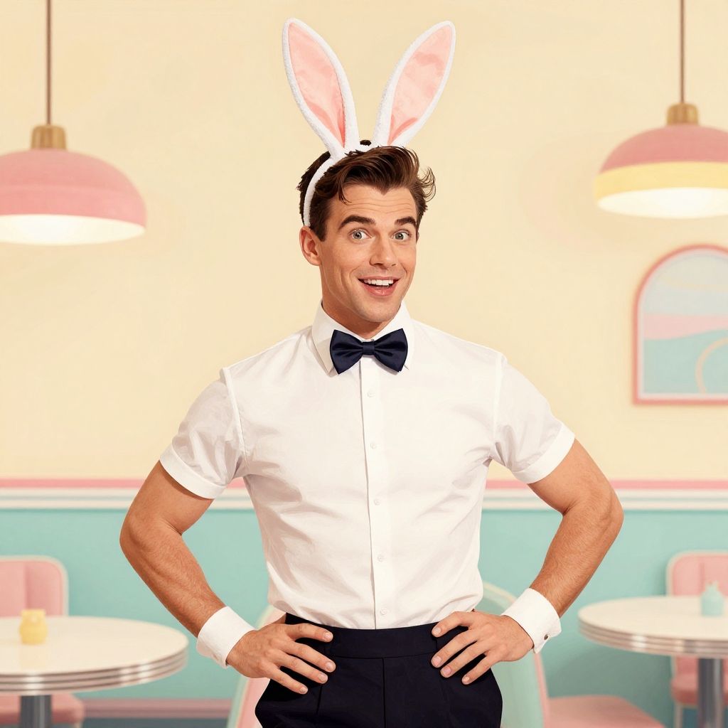Photograph of a muscular man in a white bunny suit with pink bow tie and white rabbit ears, standing in a neon-lit dance club with dancing