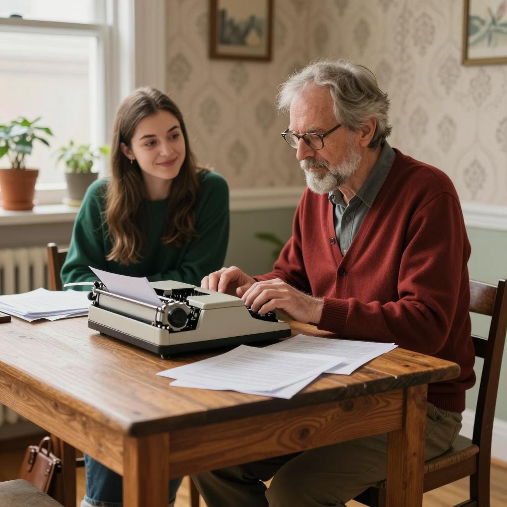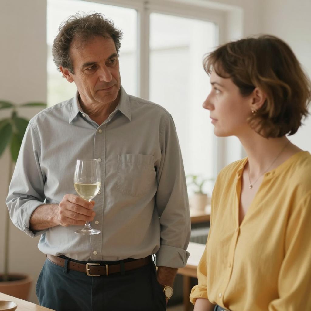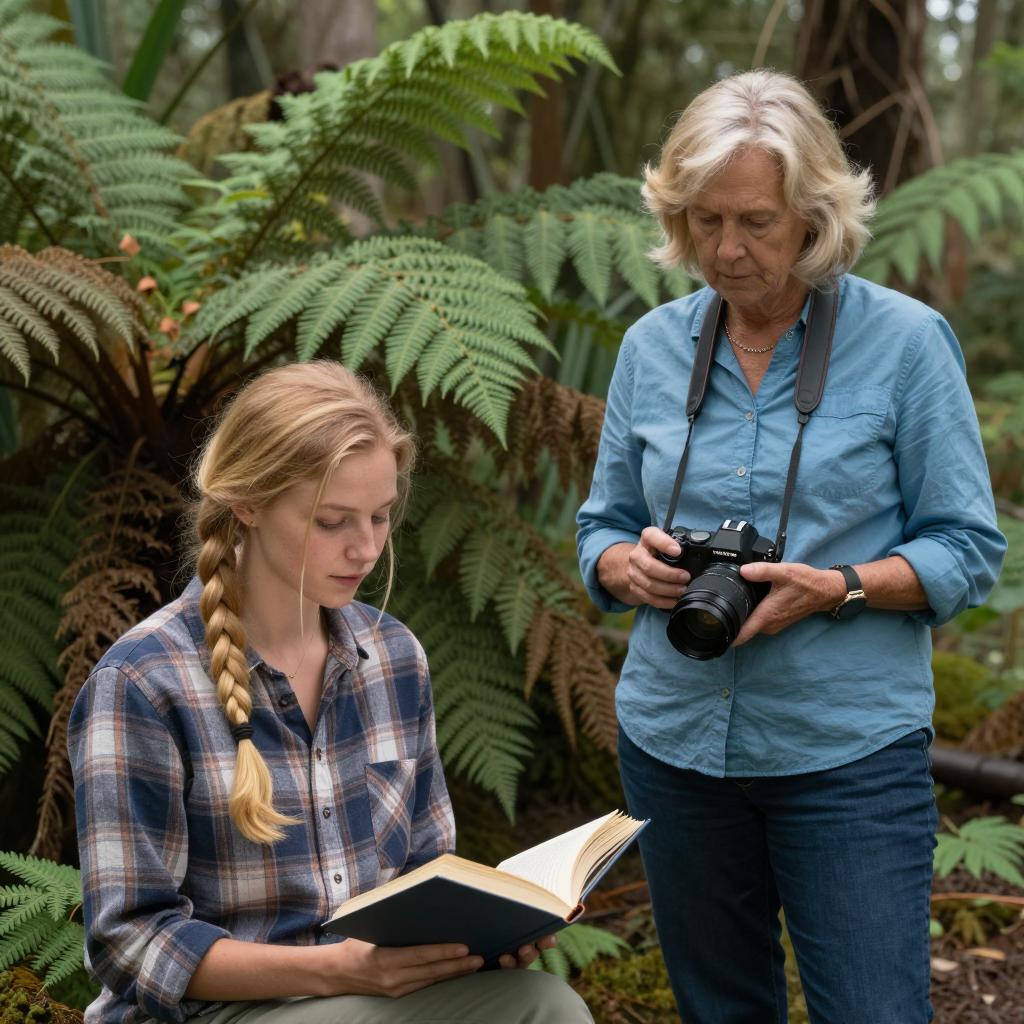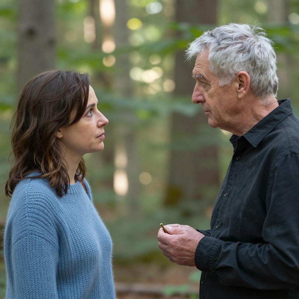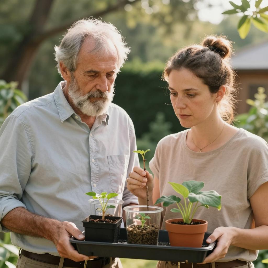 Photograph of two people outdoors. An older man with gray hair and beard wears a light shirt, standing left. A woman with brown hair in a bun wears a beige top, holding a small stick, standing right. Both look at a tray with plant pots, glass containers, and plant stems. Sunlight filters through trees in the background. The man has a neutral expression, and the woman has a focused expression. The scene is set in a garden.