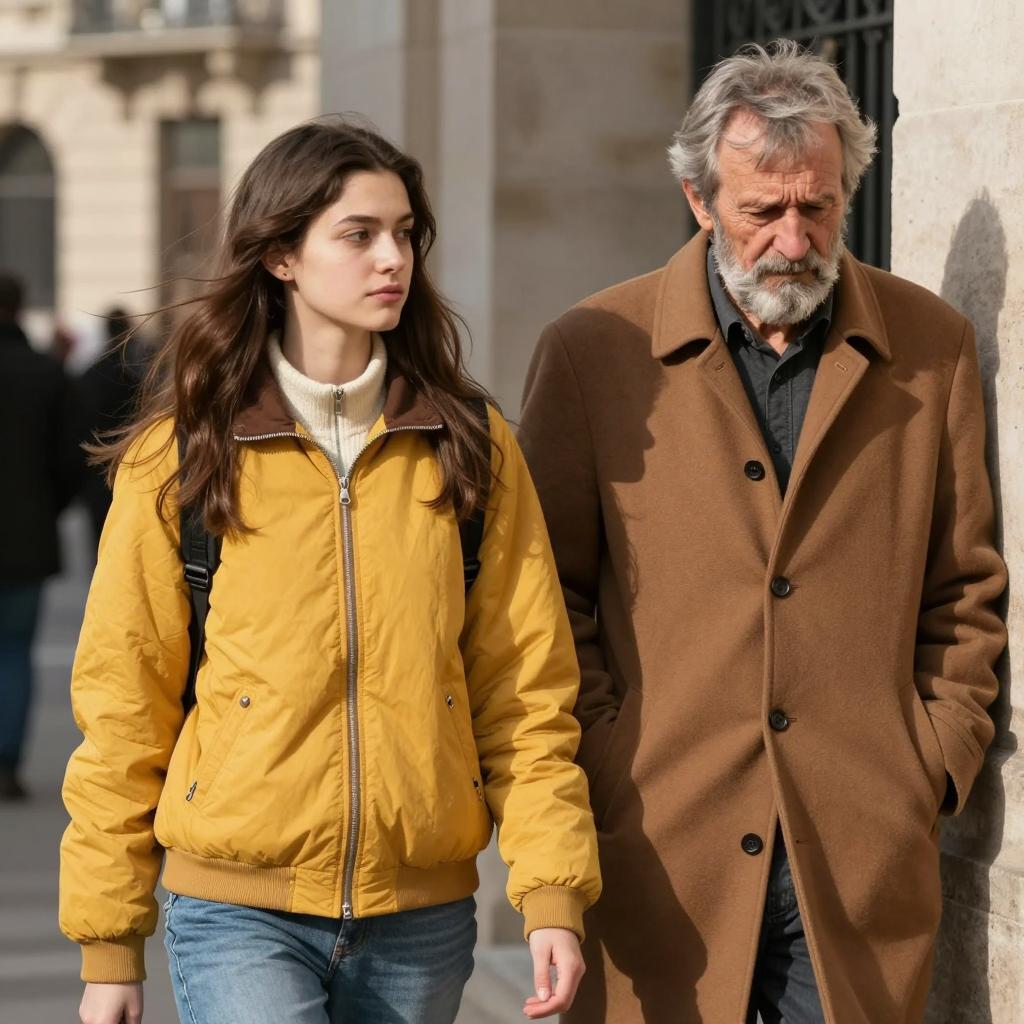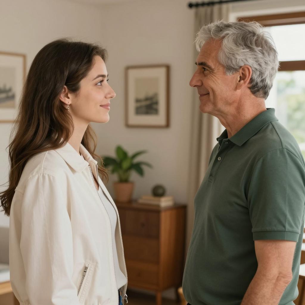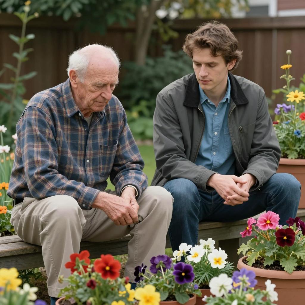 An older white man with gray hair and beard, wearing a light blue shirt, and a young white woman with brown hair tied in a bun, dressed in a beige t-shirt, are outdoors in a garden. They are holding a black tray with several potted plants and seedlings, looking attentively at the plants. The scene is lit by natural sunlight with blurred greenery in the background.